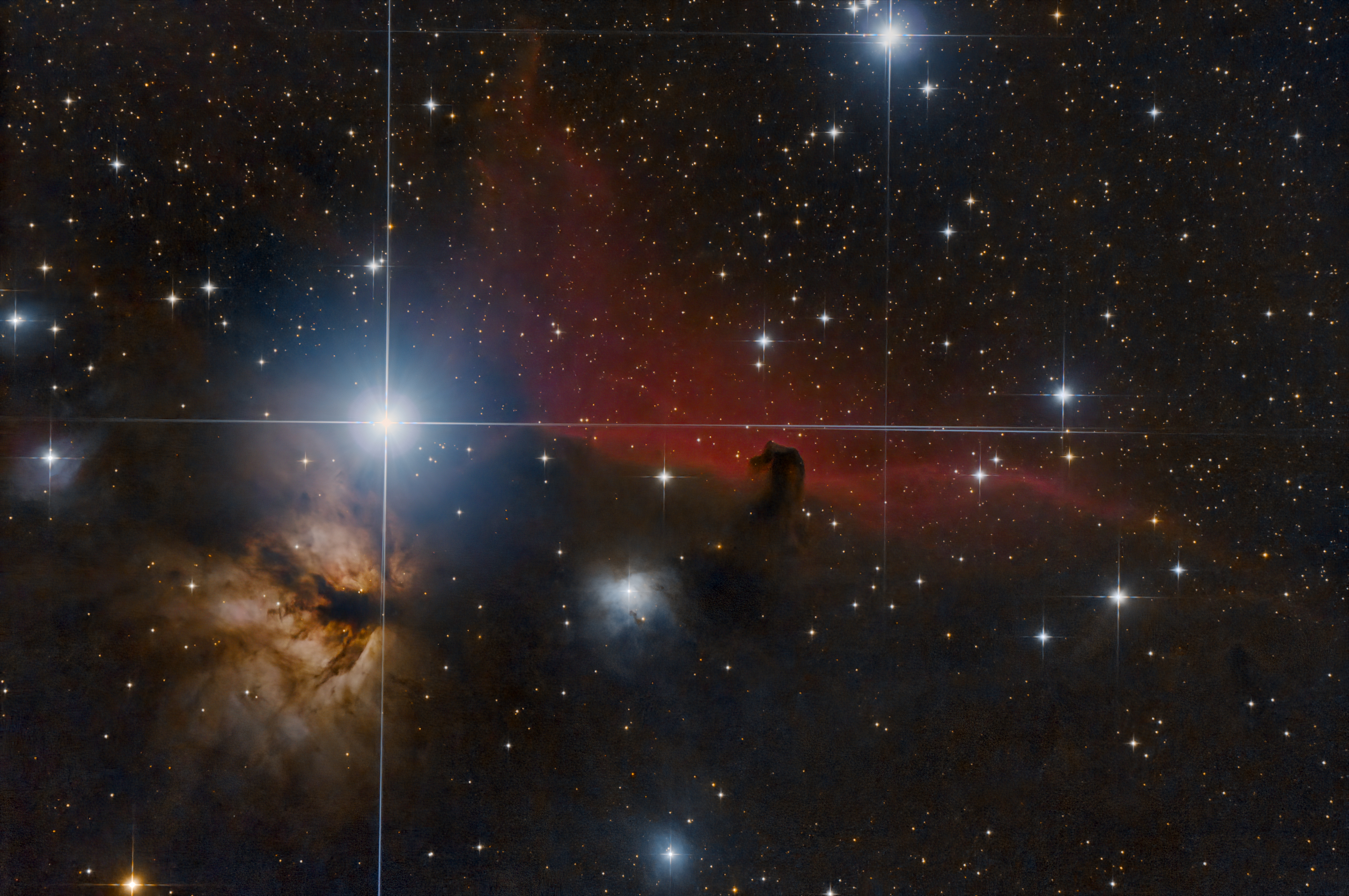 Die Gegend um Alnitak (linker Stern vom Gürtel des Orion) ist wirklich spannend! Hier haben wir es mit Reflexionsnebeln, Emissionsnebeln und Dunkelnebeln zu tun. Zu den letztgenannten zählt auch der Pferdekopfnebel B 33. Die berühmte Silhouette entsteht dadurch, dass sich ein Dunkelnebel vor dem dahinterliegenden, rot leuchtenden Emissionsnebel IC 434 befindet. Auch der Flammennebel NGC 2024 links ist ein tolles, strukturreiches Objekt.