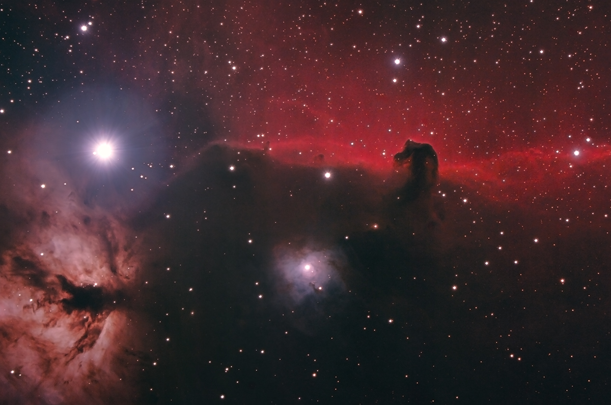 Den Pferdekopf-Nebel kann man in Wintermonaten wohl zu einem der begehrtesten Objekte für Astrofotografen zählen. Umso schwieriger gestaltet es sich, ein mit den vielen brillanten Bildern im Web vergleichbares Resultat davon aufzunehmen, wenn man ihn aus einem Wohngebiet (wenn auch mit immer noch annehmbarem Himmel) ablichtet. Noch dazu, wenn ohne Filter und mit einer Farbkamera gearbeitet wird. Man braucht die günstige Gelegenheit geringer Luftfeuchtigkeit verbunden mit einigermaßen ruhigem Seeing, um Details herauszuarbeiten und gleichzeitig eine saubere Sternabbildung zu erzielen. Der hohe Rotanteil in der Emission des leuchtenden Wasserstoffs lenkt fast von den Reflexionsnebelgebieten im Gesichtsfeld ab, die nicht weniger beeindruckend sind, wie die bekannte Dunkelwolke, die sich »in den Wasserstoff« hinein zu schieben scheint. Der helle Gürtelstern Alnitak im Orion überstrahlt einen Teil des »flammenden« Emissionsnebels NGC 2024, der ebenso zum Orion-Komplex gehört. Aufnahmeort war meine Gartensternwarte in Hauzenberg / Niederbayern. Das Bild ist ein Ausschnitt von etwa 60 Prozent.