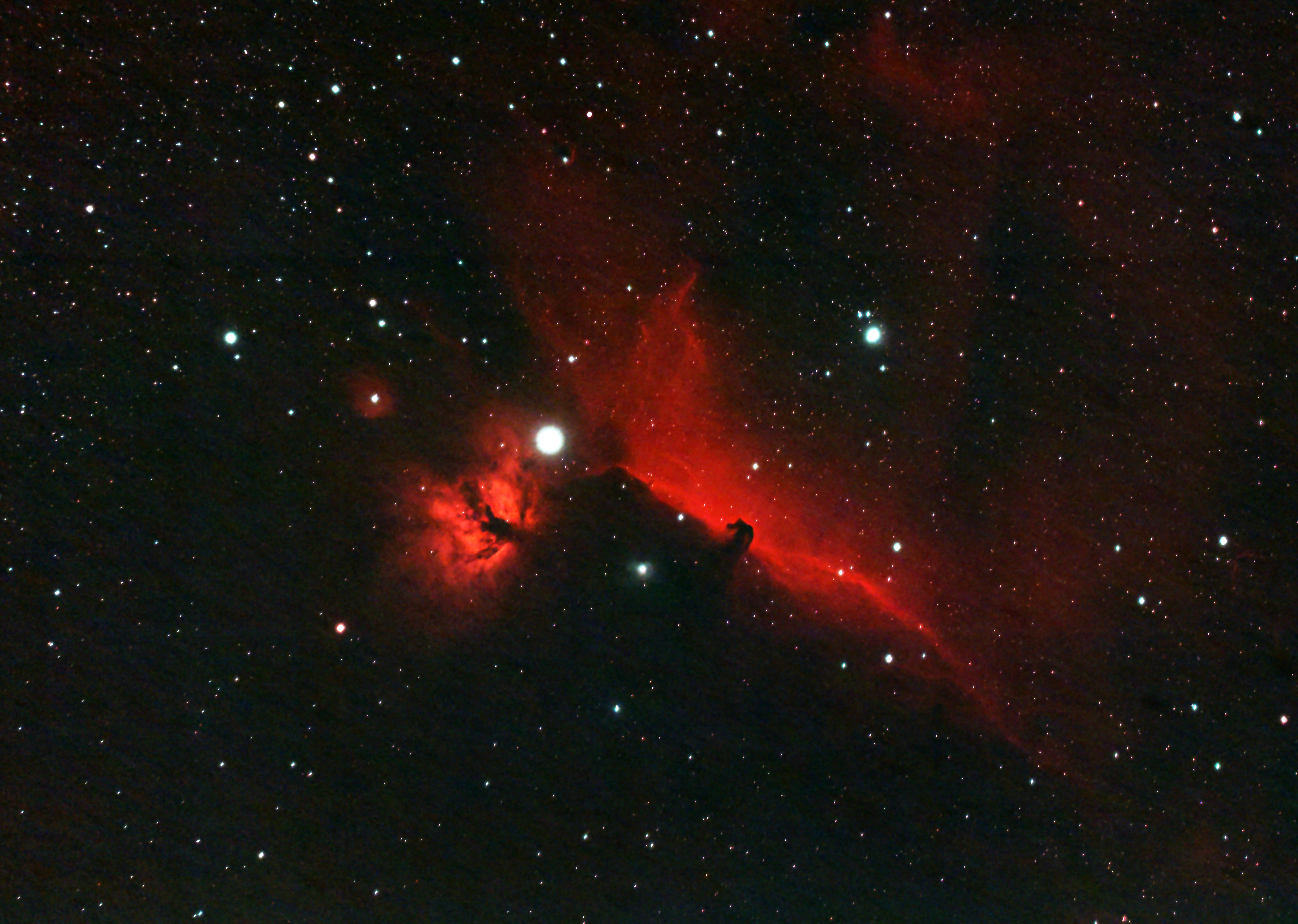 Die Aufnahme entstand am 12.12.2022 in Gerdau (Lüneburger Heide). Zur Anwendung kam ein Wasserstofffilter (L-eXtreme von Optolong) der den Pferdekopfnebel vor dem rot leuchtenden Emissionsnebel sichtbar macht.