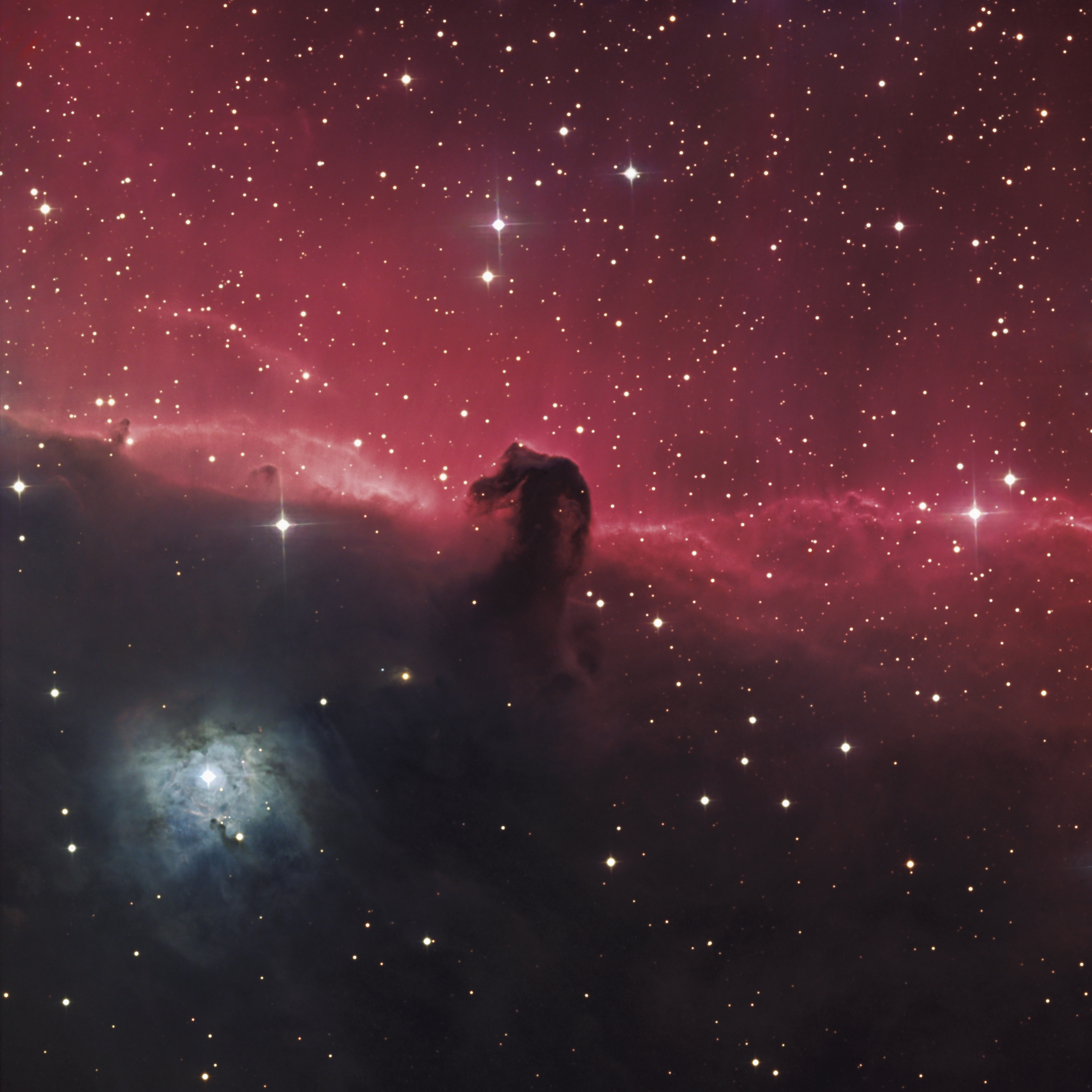Ein langer Weg für mein Lieblingsobjekt am Himmel. Die Aufnahmen im Januar 2008 waren vom Streulicht des östlichen Orion-Gürtelsterns Alnitak an der Fangspiegelstrebe beeinträchtigt. Für diesen wenige Bogenminuten breiten Bereich, welcher den Pferdekopfnebel nur knapp verfehlte, wurden im Dezember 2008 weitere Aufnahmen gewonnen, was natürlich auch dem restlichen Bild zugutekam. Eine kleine Beschreibung des Objekts findet sich unter http://www.bine-und-franz.de/astrophoto/objekte_htm/ic0434.htm.