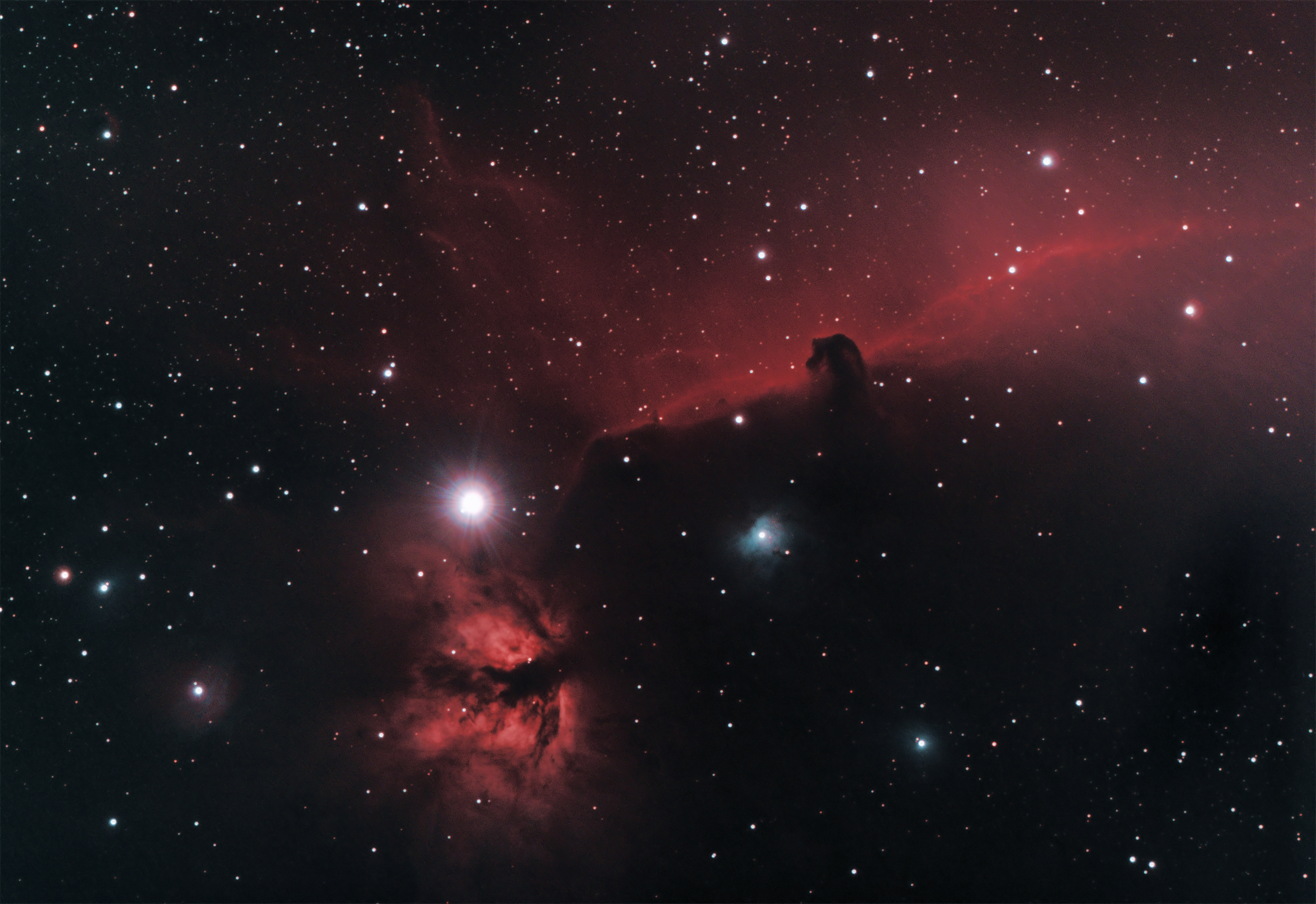 Aufnahme eines Teils des Orion-Nebelkomplexes rund um den Stern Alnitak im Gürtel des Orion mit Pferdekopfnebel (IC 434) und Flammennebel (NGC 2024)