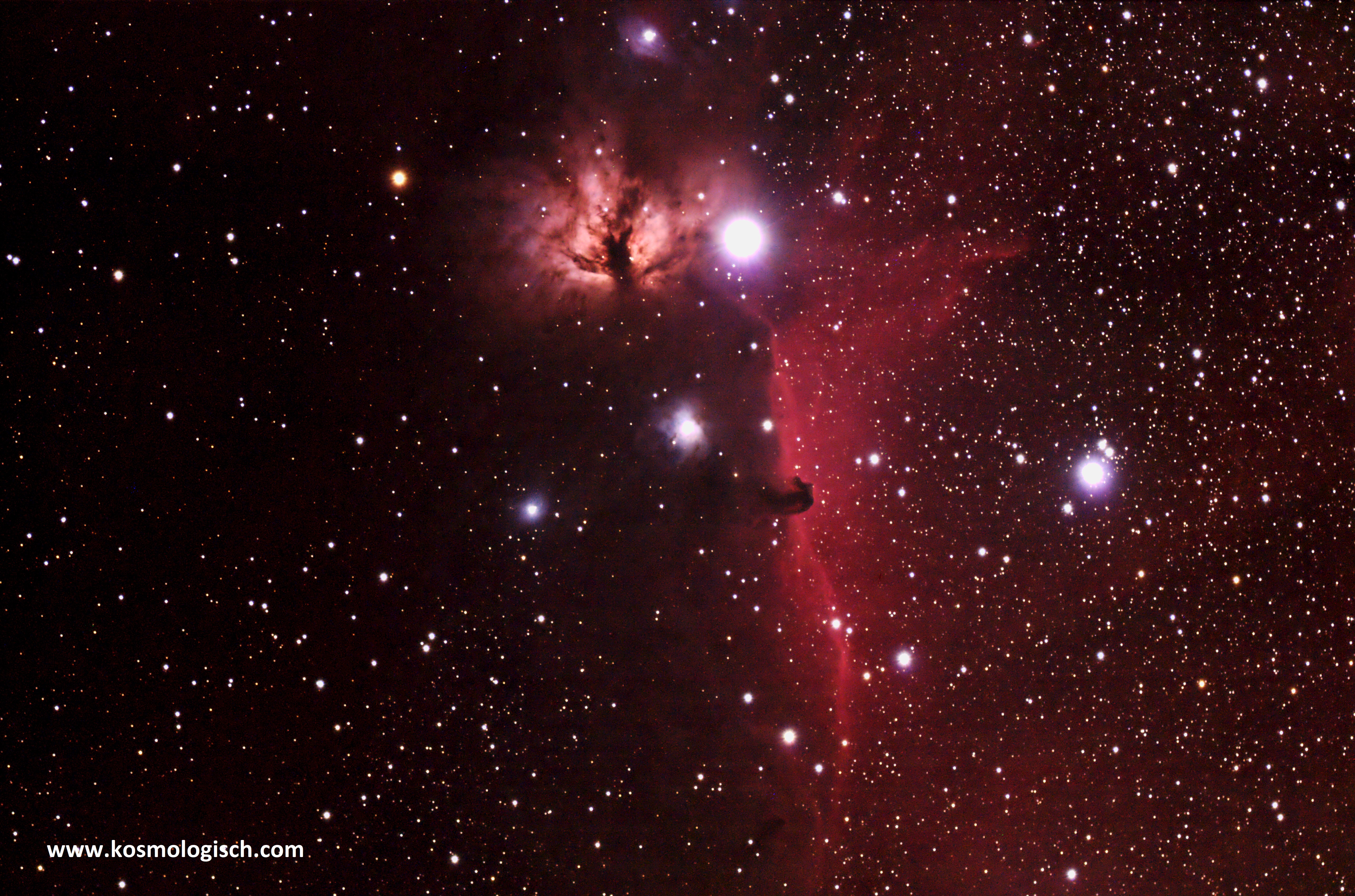 Alnitak ist der helle Stern im Bild, ein blauer Überriese in einer Entfernung von etwa 800 Lichtjahren. Die Oberflächentemperatur beträgt 25.000 Kelvin - Spektralklasse O9. Alnitak hat einen Begleiter - Alnitak Ab wurde aber erst Ende der 1990er Jahre entdeckt. Zum Nebelkomplex gehört der Flammennebel und der Pferdekopfnebel. Letzteres hat eine Ausdehung von etwa drei Lichtjahren. Seine Form wird sich durch die Ausdehnung verändern.