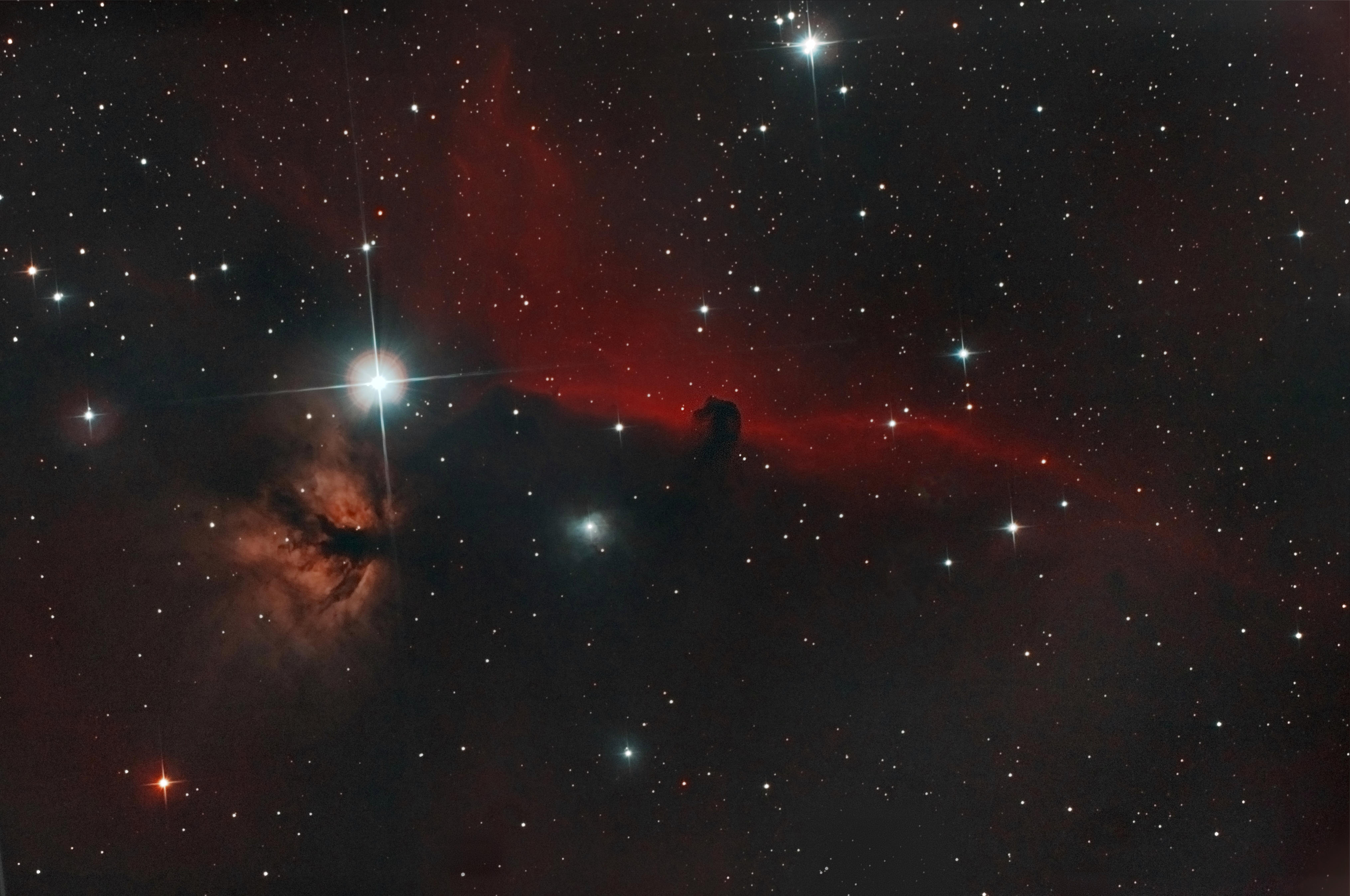 Schon oft fotografiert und gezeigt, die HII-Region IC 434 mit dem Pferdekopfnebel B 33 und dem Reflexionsnebel NGC 2024. Gleichwohl reizte es mich, diese interessante Region mit meinem 130/650-Millimeter-Newton-Teleskop von meinem lichtbelasteten Balkonstandort aus innerhalb von zwei Nächten abzulichten, bevor in Blickrichtung West befindliche Wohnbauten meine Bemühungen beenden konnten. Glücklicherweise gab es eine kleine Schönwetterkatastrohpe, so dass das Vorhaben einigermaßen gelang.