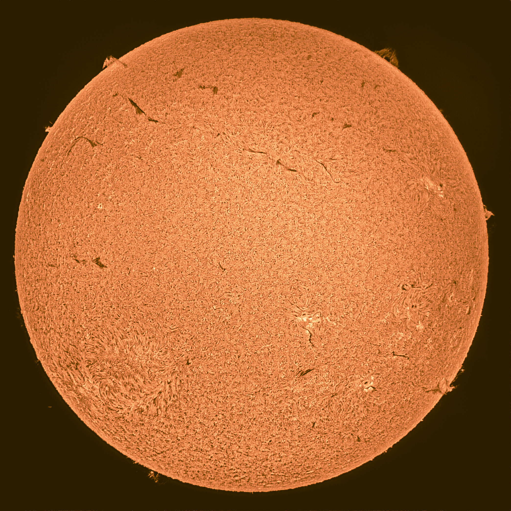 Der Trend der Sonnenaktivität zeigt, dass es kontinuierlich nach oben in Richtung Maximum geht. Hier eine H-Alpha-Aufnahme am Freitag vor Pfingsten.