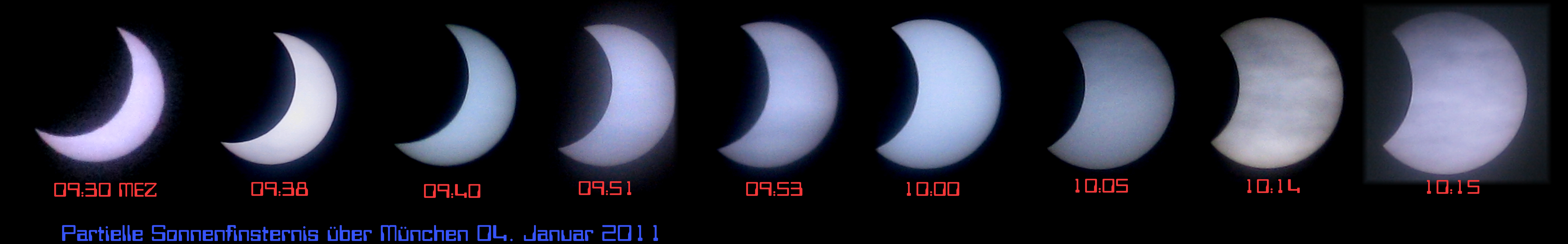 Zunächst war der Himmel bedeckt. Aber pünktlich zur größten Überdeckung wurde in München der Blick zur Sonne freigegeben. Das Bild zeigt die Phasen der abnehmenden, partiellen Sonnenfinsternis vom 4. Januar 2011.