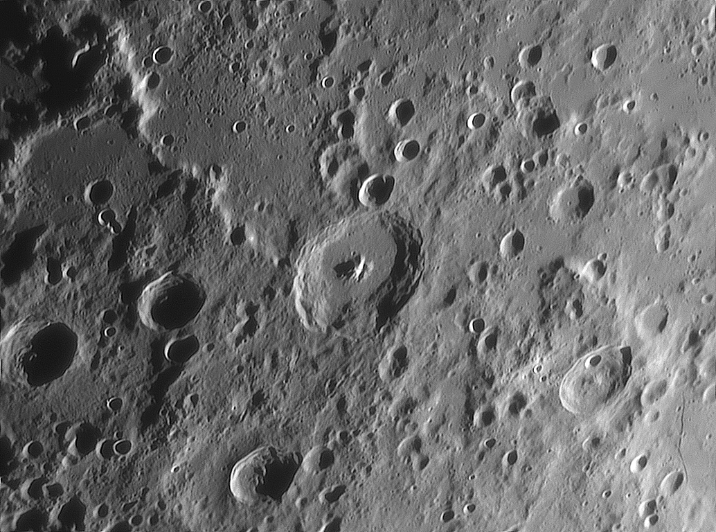 Piccolomini mit seinem ausgeprägten Zentralgebirge begrenzt die Rupes. Am rechten unteren Bildrand fällt eine namenlose Rille nahe des Kraters Neander auf.