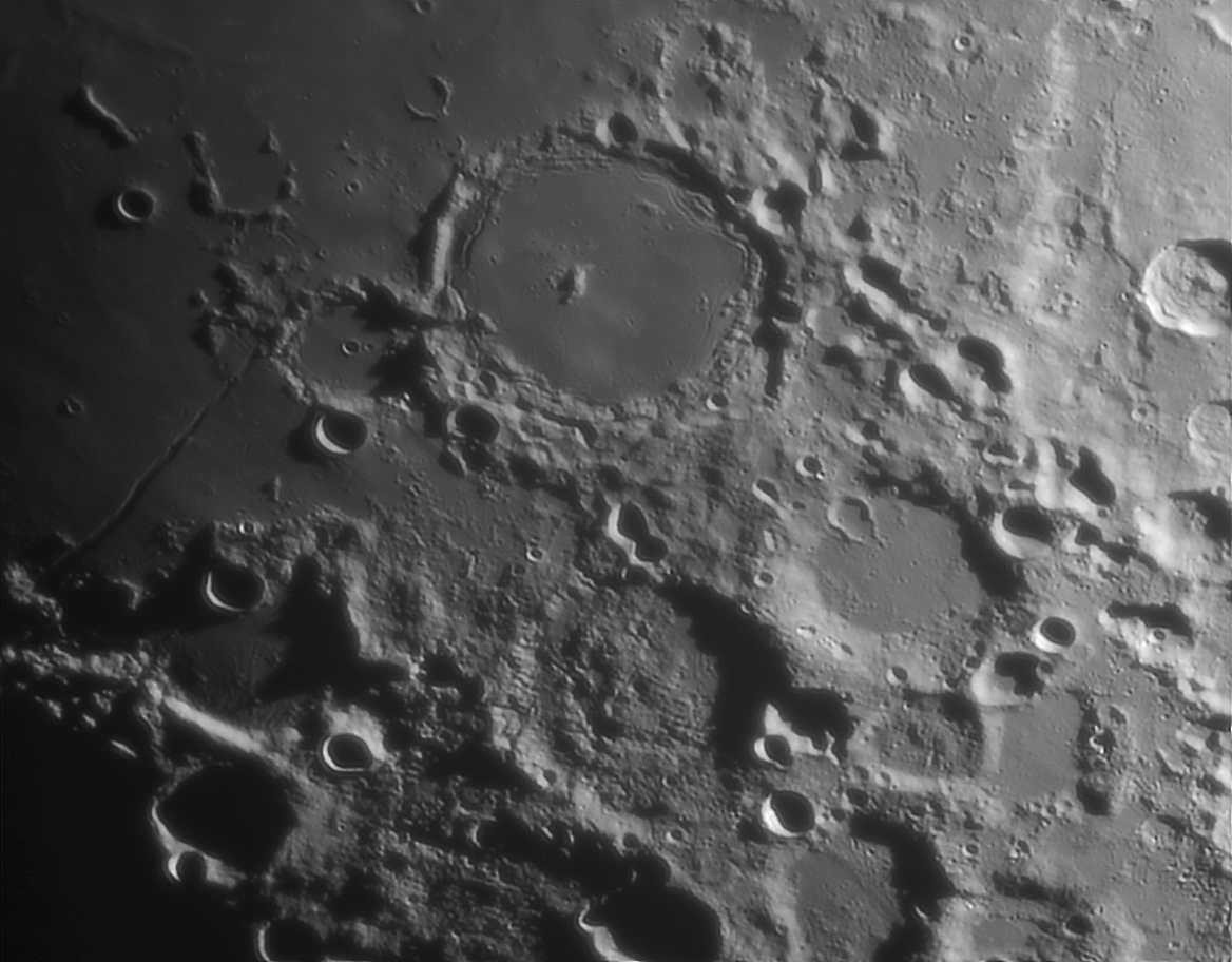 Der Kraterinnenrand von Pitatus ist zu zwei Dritteln von einem Rillensystem umschlossen. Auffallend auch der nicht mittig gelegene Zentralberg. Der südlich von Pitatus gelegende Krater Wurzelbauer lässt mich rätseln, welches Ereignis diese Gegend so zernarbt hat.