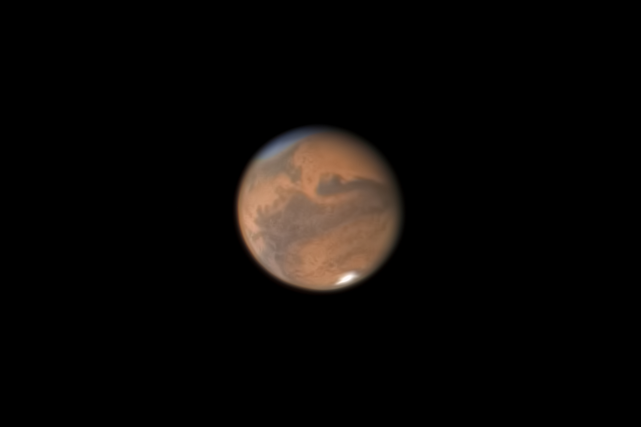 Am Abend des 18. September 2020, kurz nach dem öffentlichen Beobachtungsabend an der Sternwarte Radebeul/Sa., gelang Martin Fiedler und mir eines der bisher detailreichsten und schärfsten Aufnahmen des Planeten Mars! Das Seeing war selbst für unsere Region ein Traum! Unglaublich viele Strukturen der Marsoberfläche kamen so zum Vorschein, selbst Details an der südlichen Polkappe waren deutlich zu sehen! Beeindruckend auch immer wieder die nördlich-bläuliche Polarhaube. Schon bei der Videoerstellung wussten wir, dass es einer der besten Abende bisher für den Roten Planeten war. Visuell im Teleskop eine Augenweide! Man darf gespannt sein, was noch so kommen wird diesbezüglich in der bevorstehenden Marsopposition.