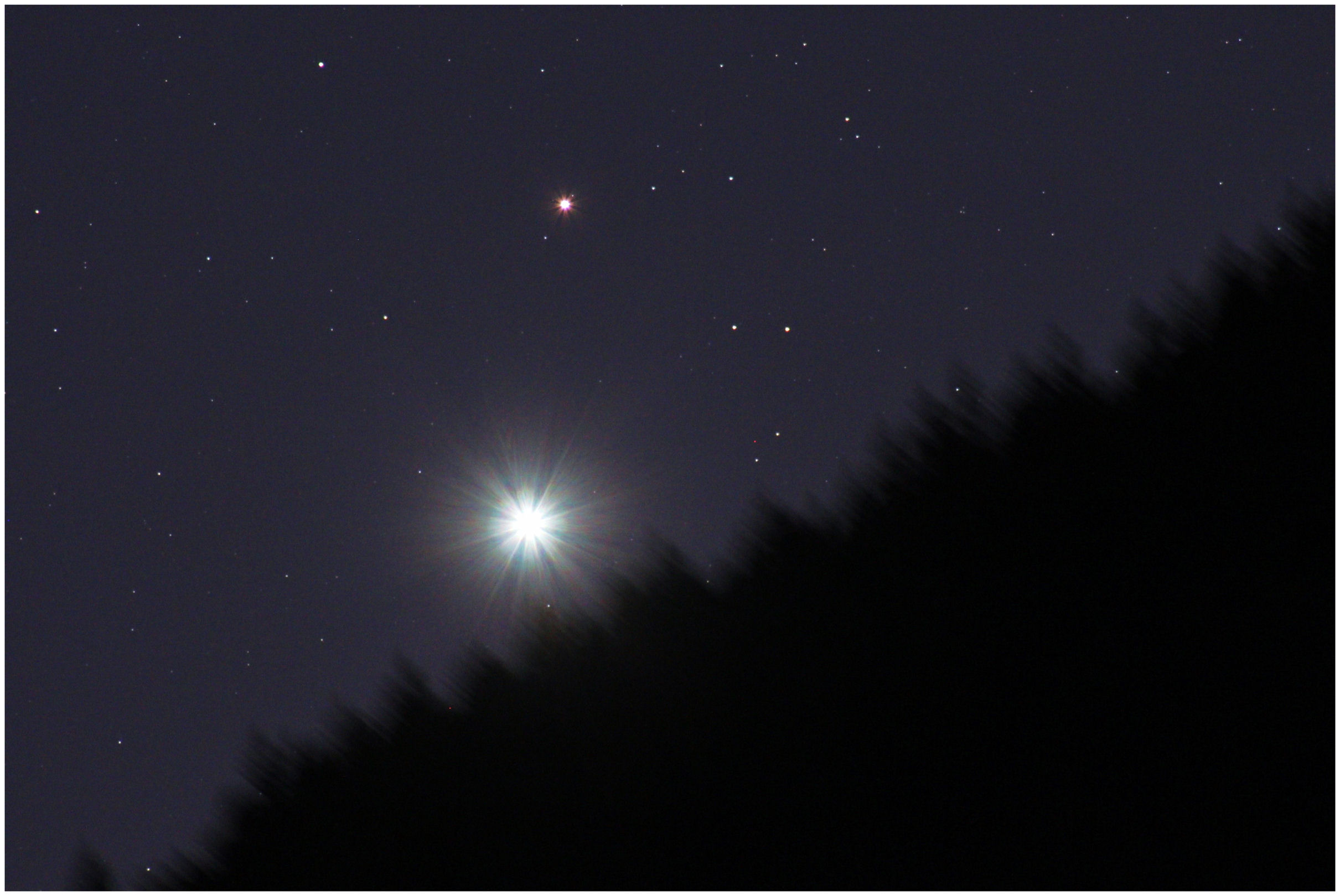 Venus und Mars kurz vor dem Verschwinden hinter einem Bergrücken am 20.2.2015.