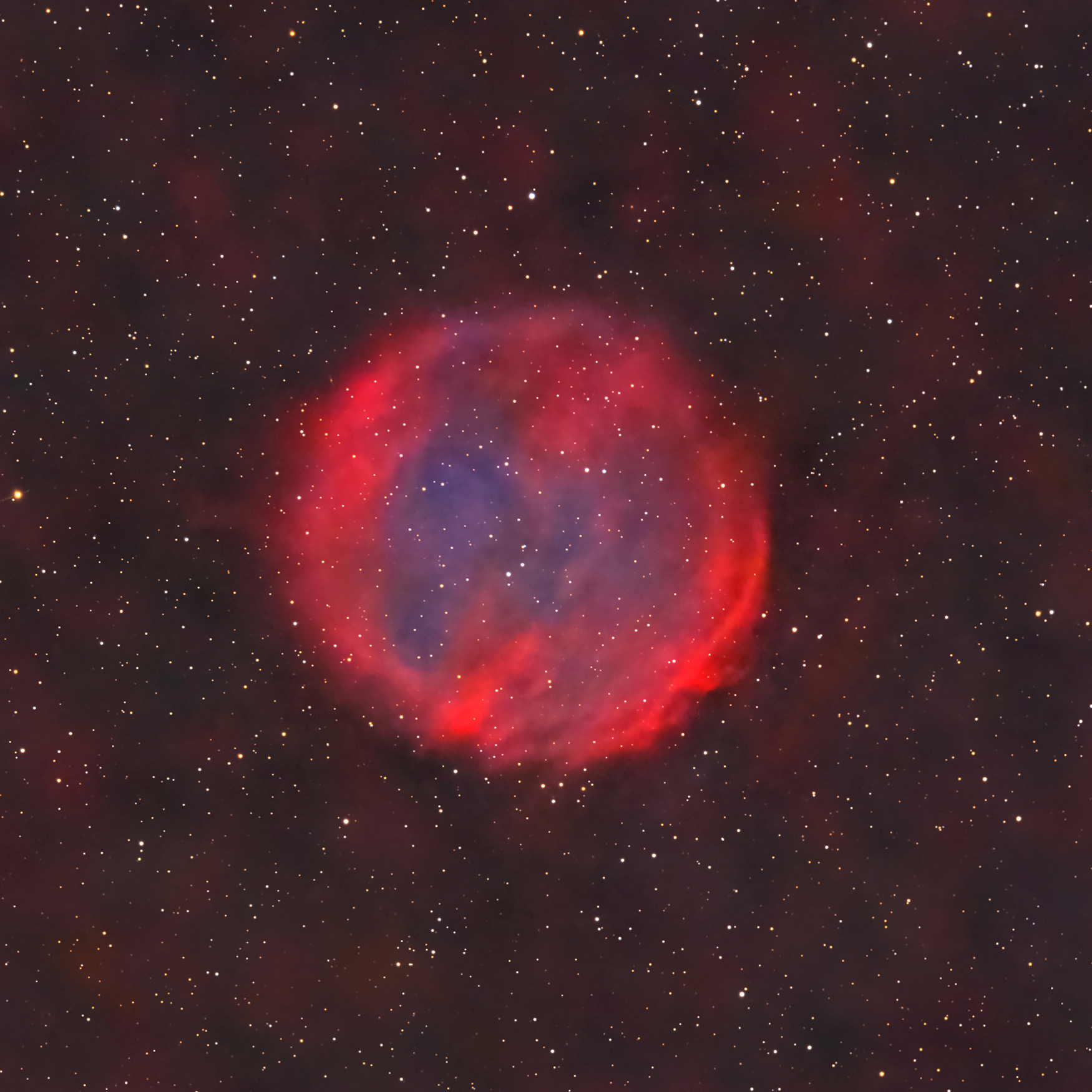 Ich kehrte zu diesem sehr schwachen Planetarischen Nebel zurück, um zu versuchen, das Ergebnis des letzten Jahres zu verbessern, als ich mit meinen beiden Teleskopen über 63 Stunden lang Signale gesammelt hatte. Mit dem diesjährigen Signal habe ich es fast verdoppelt und habe zum ersten Mal die 100-Stunden-Integration auf demselben Deep-Sky-Objekt überschritten. Ich muss sagen, dass die Verbesserung vor allem am sehr schwachen H-Alpha-Signal im Hintergrund zu sehen ist die auf dem Umriss der Blase (zum Beispiel der Puff, der links zu sehen ist). Das Motiv des Bildes ist der Planetarische Nebel PuWe1 (Purgathofer-Weinberger 1), der sich im Sternbild Luchs befindet. PuWe1 wurde 1980 von Alois Purgathofer und Ronald Weinberger durch die Analyse von Platten des Palomar Deep Sky Survey entdeckt und ist mit einem Durchmesser von 20 Bogenminuten (mehr oder weniger wie der Vollmond) einer der größten und schwächsten Planetarischen Nebel, die an unserem Himmel sichtbar sind. Außerdem ist er mit einer Entfernung von nur 1200 Lichtjahren einer der nächstgelegenen.
