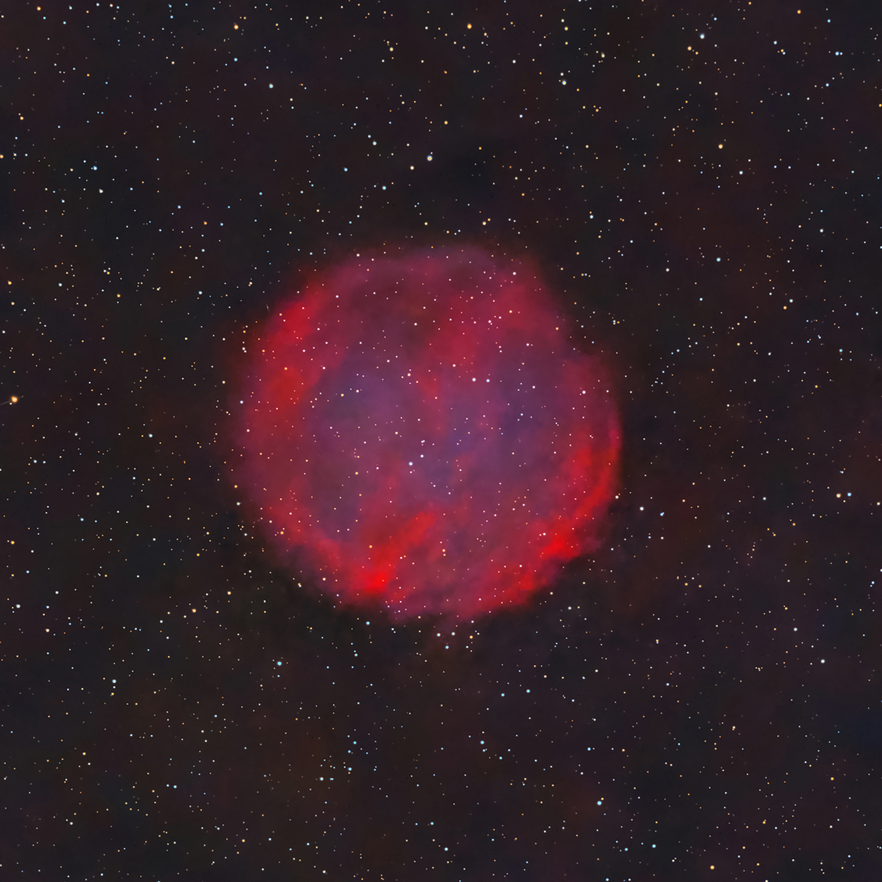 Ich habe Mitte September mit der Aufnahme dieses Planetarischen Nebels begonnen und mit viel Geduld aus zwei Gründen so viele Aufnahmen wie möglich gesammelt: Erstens, um einen angemessenen SNR-Wert zu erreichen, der es mir ermöglicht, in der Postproduktion so viel wie möglich hervorzuheben. Der Nebel löst sich – definitiv sehr schwach – vom Himmelshintergrund. Zweitens wollte ich versuchen, das sehr schwache H-Alpha-Hintergrundsignal herauszufiltern. Ich glaube, ich habe das erste Ziel erreicht und das zweite nur teilweise, aber ich bin dennoch zufrieden, wenn man bedenkt, dass ich unter einem lichtverschmutzten Stadthimmel fotografiere. Das Motiv des Fotos ist der Planetarische Nebel, der unter dem Akronym PuWe1 (Purgathofer-Weinberger 1) oder PK158+17.1 bekannt ist und sich im Sternbild Luchs befindet und mit meinen beiden Aufbauten (ED80-Refraktor und Konus 200/1000) abgebildet wurde. PuWe1 wurde 1980 von Alois Purgathofer und Ronald Weinberger durch die Analyse von Platten des Palomar Deep Sky Survey entdeckt und ist mit einem Durchmesser von 20 Bogenminuten (mehr oder weniger wie der Vollmond) einer der größten und am schwersten fassbaren Planetarischen Nebel, die an unserem Himmel sichtbar sind ); Außerdem ist er mit einer Entfernung von »nur« 1200 Lichtjahren einer der nächstgelegenen.