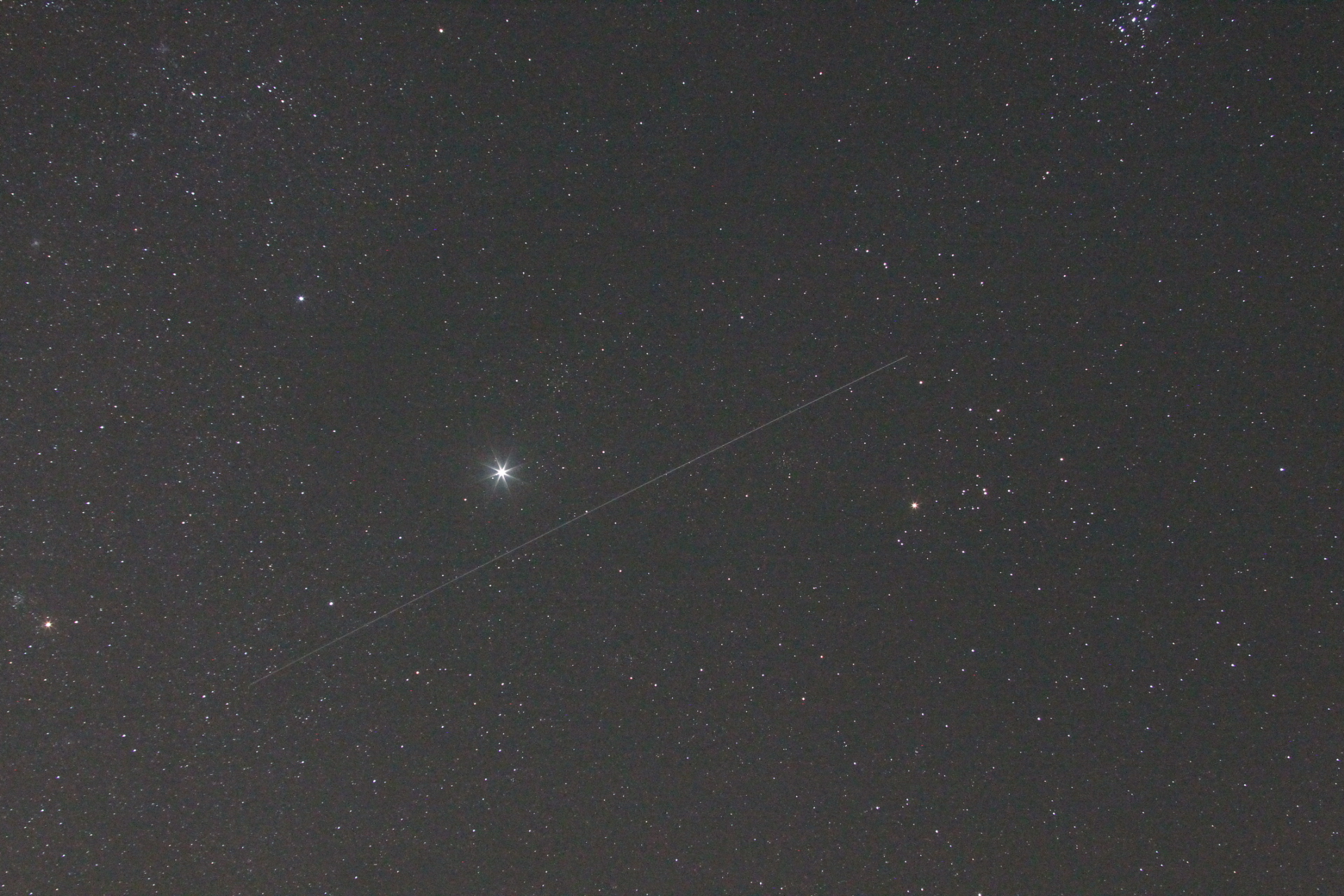 Am Sonntagmorgen, 8. September 2024 gegen 04:00 Uhr war ein so klarer und interessanter Sternenhimmel, dass ich unbedingt schnell nochmal mit der Fotoausrüstung raus musste. Einen Überblick konnte ich mit 35 mm Brennweite festhalten. Am oberen Bildrand die Plejaden, rechts am Bildrand ist Uranus noch mit auf dem Bild. In der Mitte der Jupiter und die Strichspur eines Satelliten. Am linken Bildrand der Mars mit dem offenen Sternhaufen M 35 in den Zwillingen. In dem Bereich oben links sind M 38, M 36 und M 37 im Fuhrmann zu erkennen.