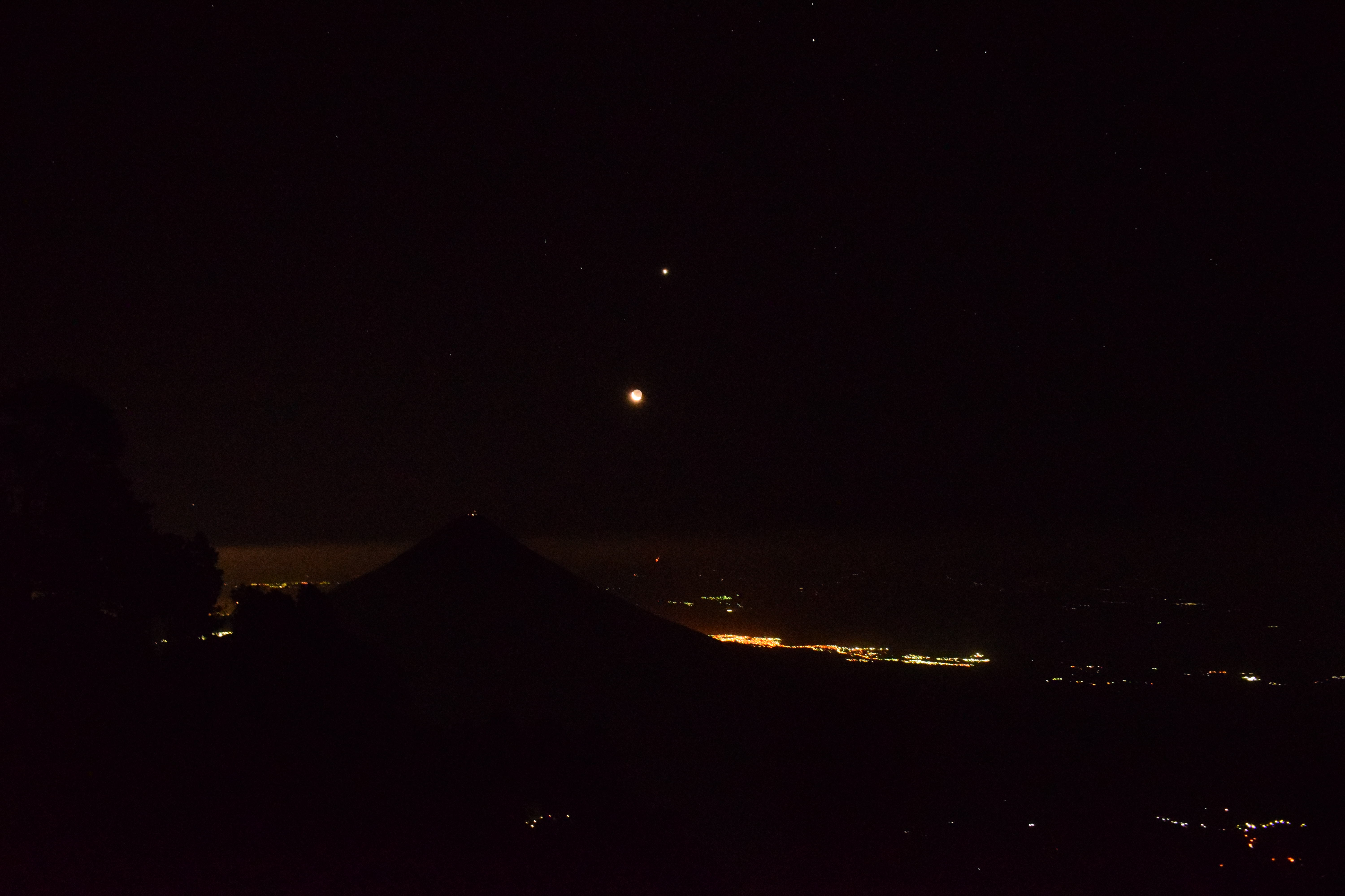 Auf dieser Aufnahme sind der Mond, die Venus und am oberen Bildrand Saturn zu erkennen. Sie standen am frühen Morgen des 3. März 2019 hoch über der Stadt Antigua und dem kleinen Vulkan Pacaya, dessen kleines rotes Feuer sogar im Dunst zu sehen ist.