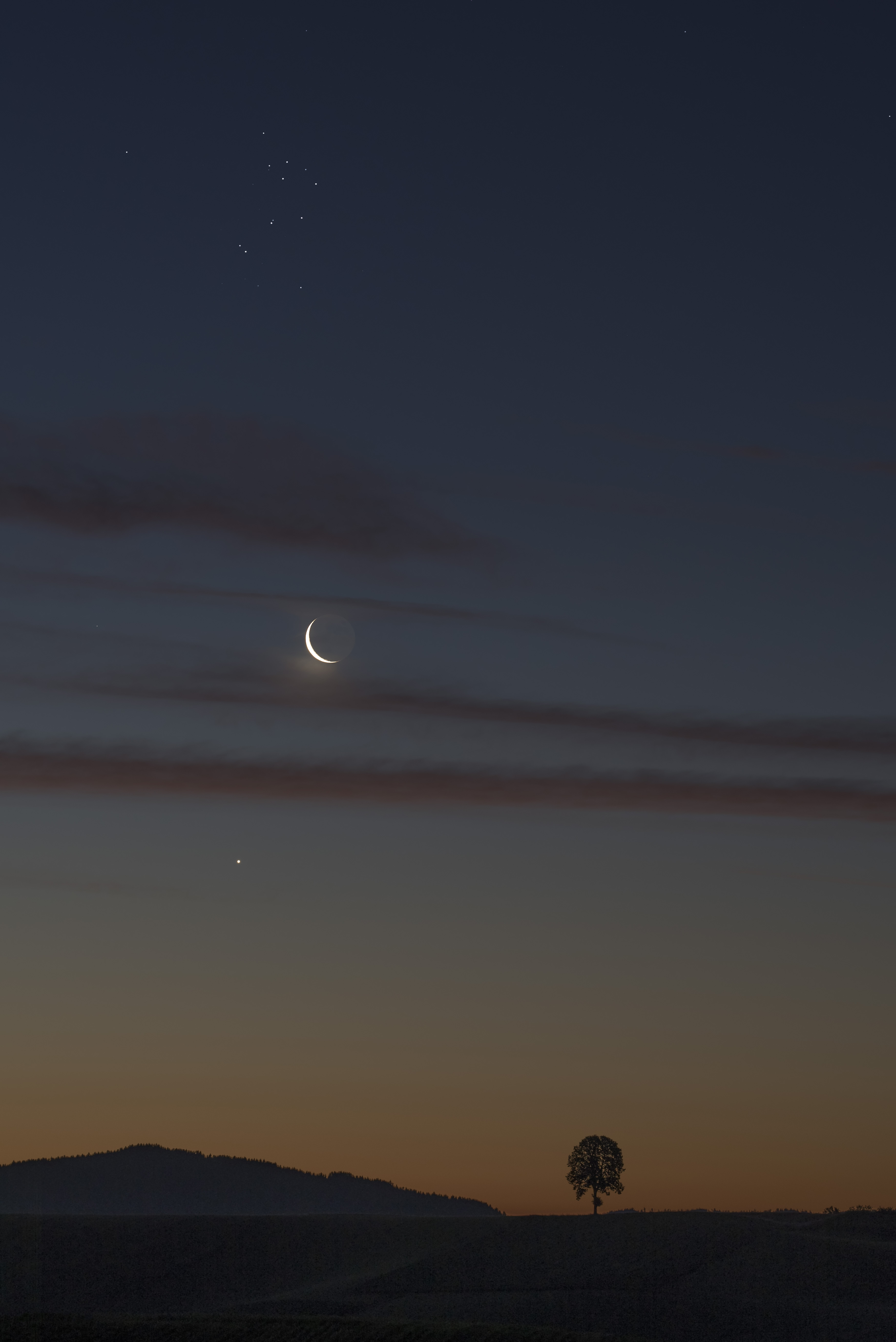 Ende Juni 2022 reihten sich die Planeten Merkur, Venus, Mars, Jupiter, Saturn und Uranus in einer eindrucksvollen Kette aneinander. In den frühen Morgenstunden des 26. Juni 2022 ergab sich dieser stimmungsvolle Anblick, der eine Annäherung der Plejaden mit der abnehmenden Modsichel und dem Planeten Venus zeigt. Aufgenommen in Waldzell in Oberösterreich mit einer Nikon D750 und einem Sigma Art Teleobjektiv mit 135 mm Brennweite.