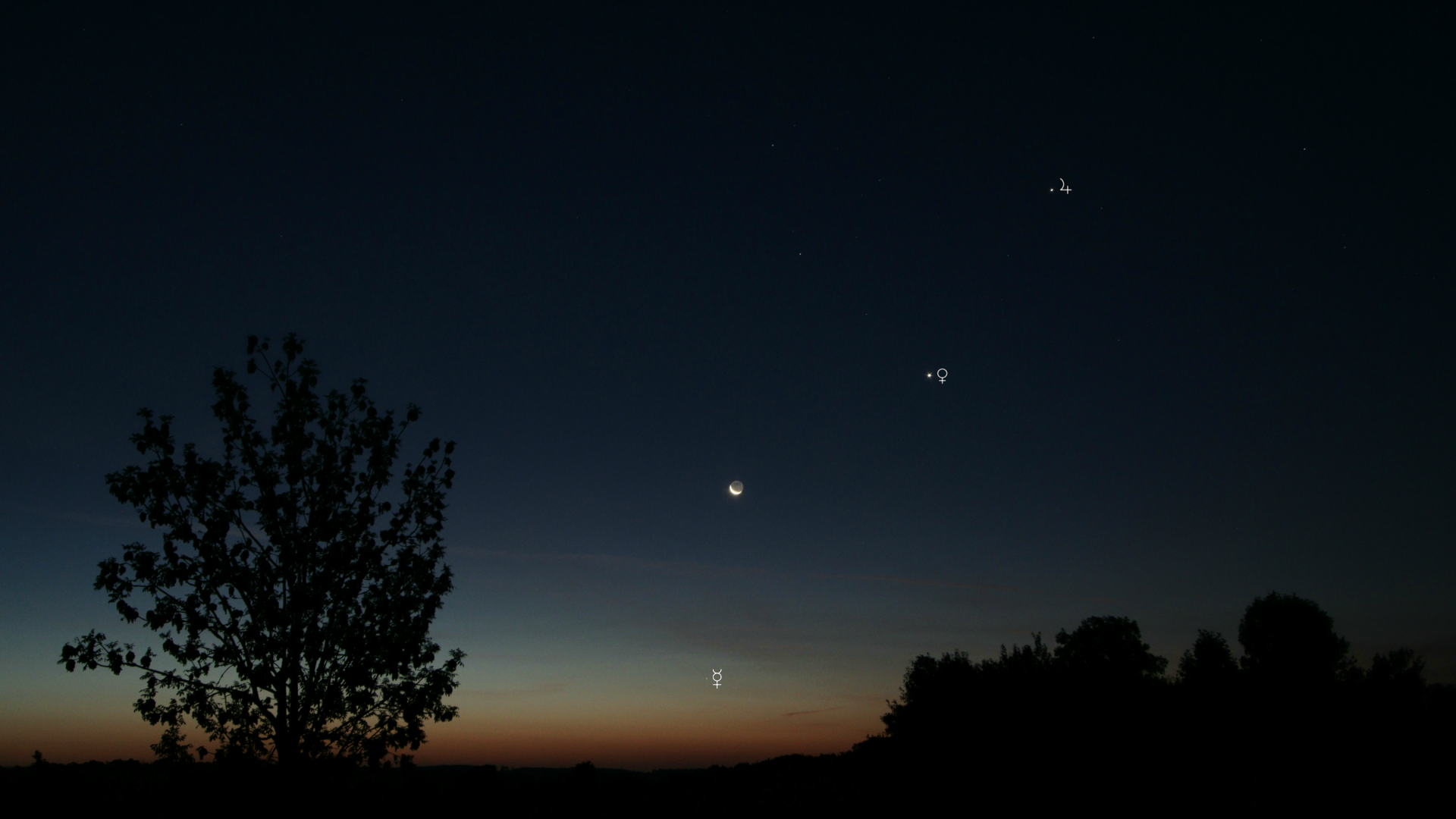 Merkur, Venus und Jupiter zusammen mit dem abnehmenden Mond am Morgenhimmel.