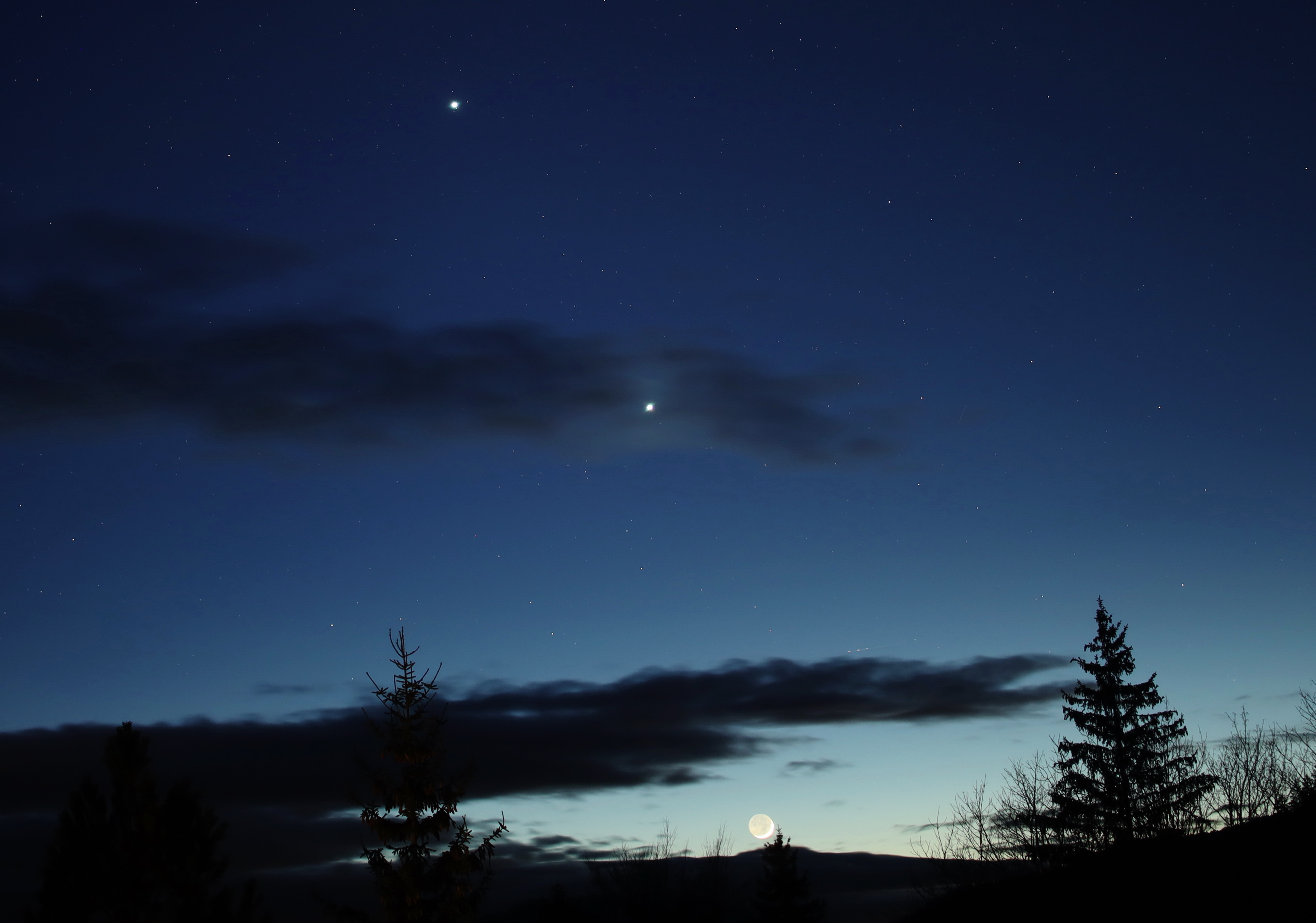 Am Abend des 21. Februar 2023 konnte ich die schöne Konstellation der beiden Planeten Jupiter und Venus zusammen mit der zunehmenden Mondsichel über dem Westhorizont in Puchenstuben, NÖ, aufnehmen.