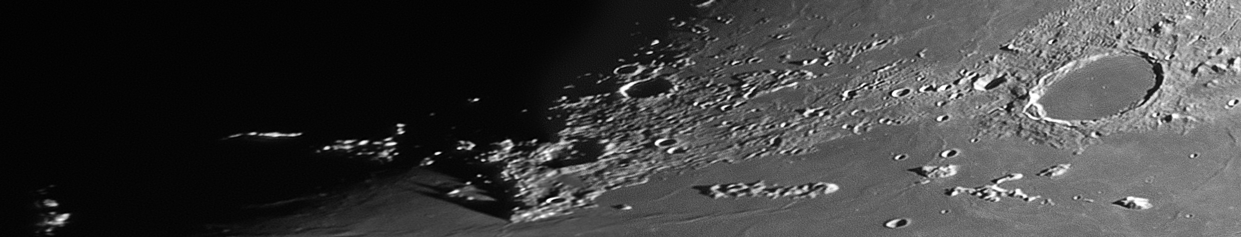 Während die Sonne Plato schon voll erhellt, berührt sie über dem Sinus Iridum nur die höchsten Wallspitzen. Das Panoramaprogramm hat die zwei Bilder, die dieses Panorama bilden, auf seltsame Art und Weise zusammengesetzt, was aber eine besondere Atmosphäre kreiert.