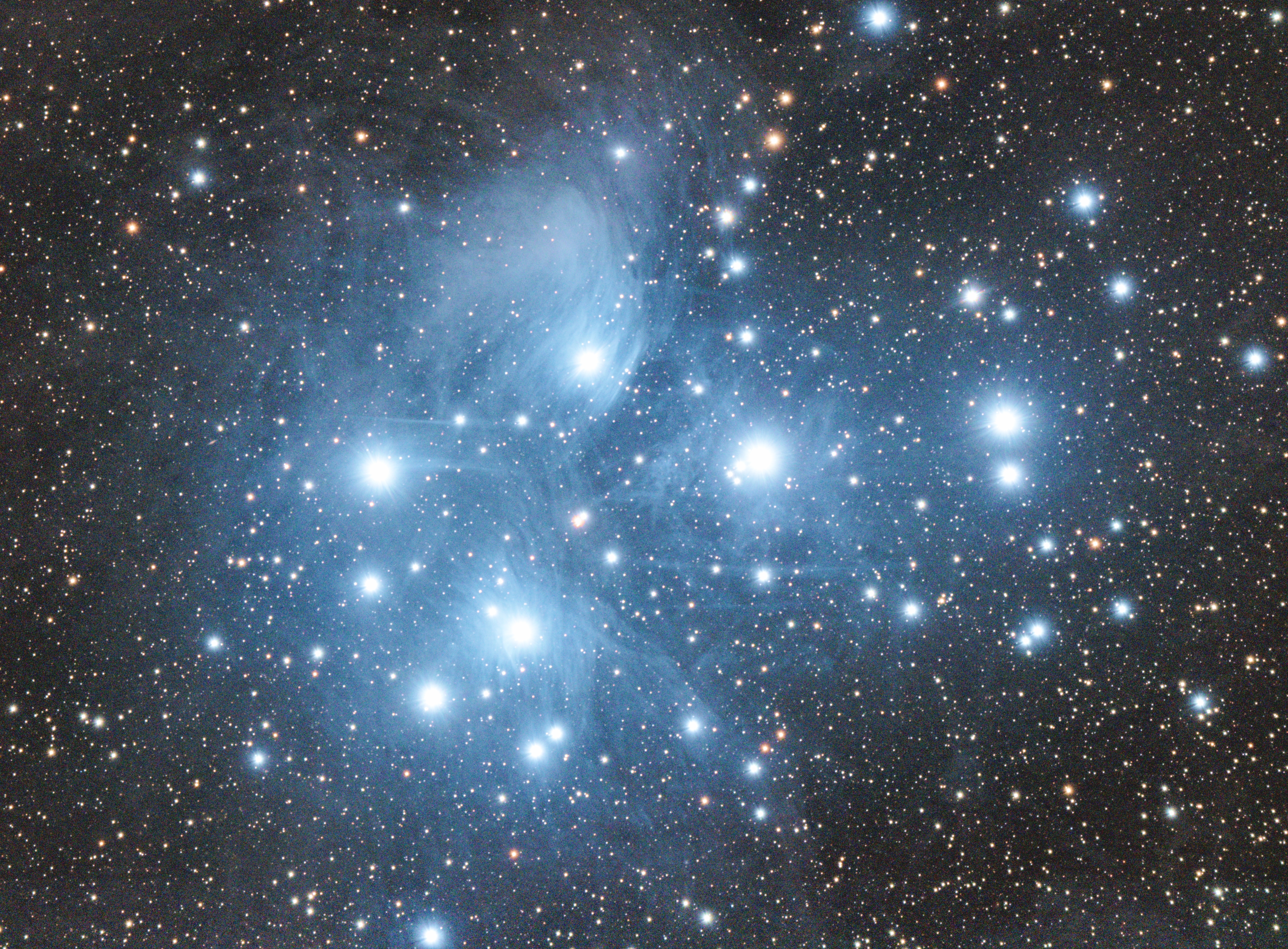 Die Plejaden, auch Sieben Schwestern oder Subaru genannt, sind ein relativ junger offener Sternhaufen im Sternbild Stier. Die Plejaden haben in vielen Kulturen eine besondere Bedeutung, sie werden sogar in der Bibel erwähnt. Kein Wunder, dass der japanische Autohersteller Subaru die sieben Sterne der Plejaden als Logo gewählt hat. Die Entfernung zur Erde ist für astronomische Verhältnisse mit etwa 440 Lichtjahren eher klein. In sehr klaren und dunklen Nächten sind die Plejaden sogar mit bloßem Auge zu erkennen. Die schöne blaue Farbe entsteht durch die Reflexion des Lichts sehr heißer Sterne an der umgebenden Staubwolke.
