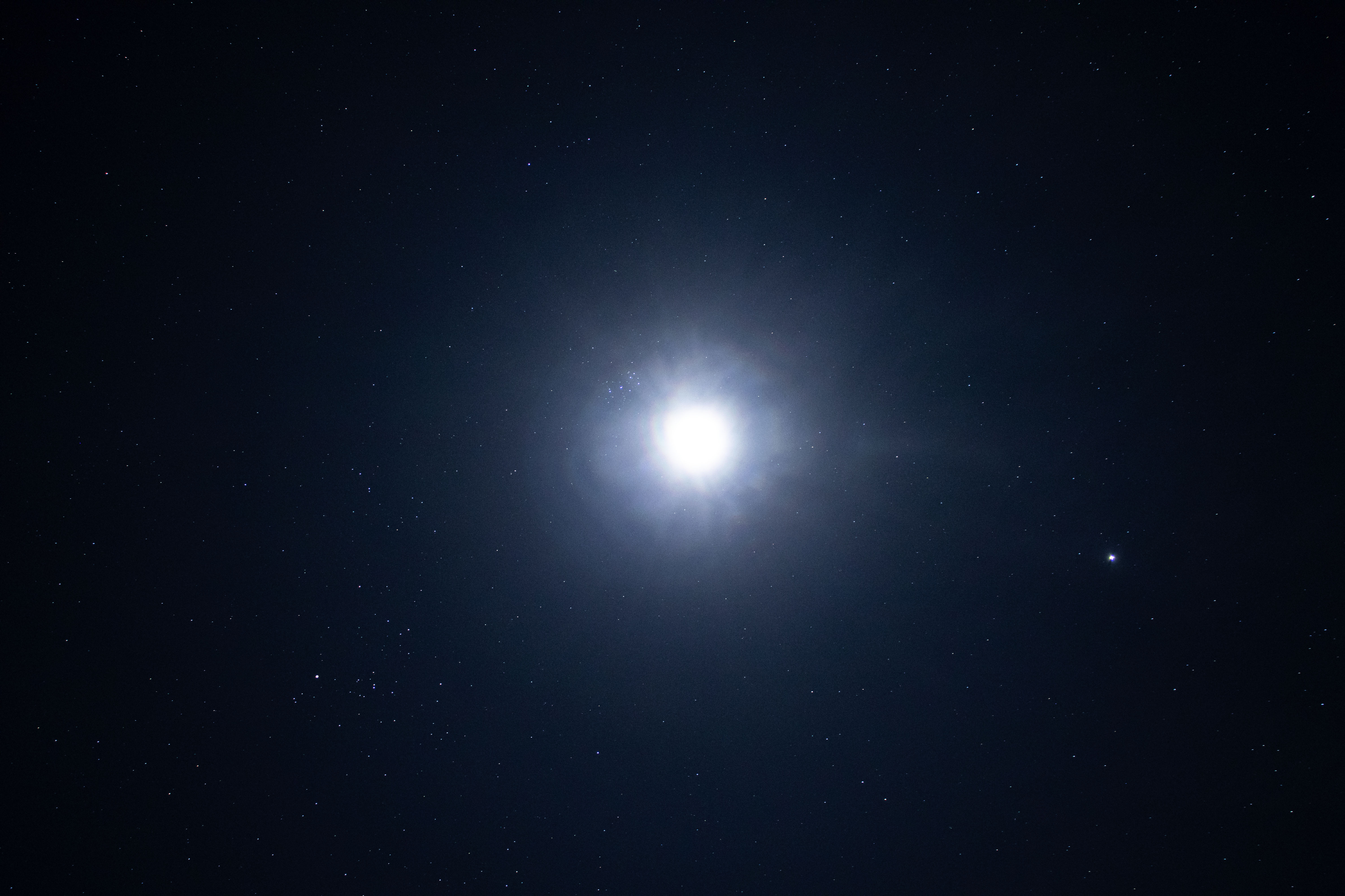 Konjunktion vom Mond mit dem Siebengestirn und Uranus. Weiter westlich ist auch noch Jupiter mit von der Partie. Ein seltenes Treffen am Morgenhimmel.