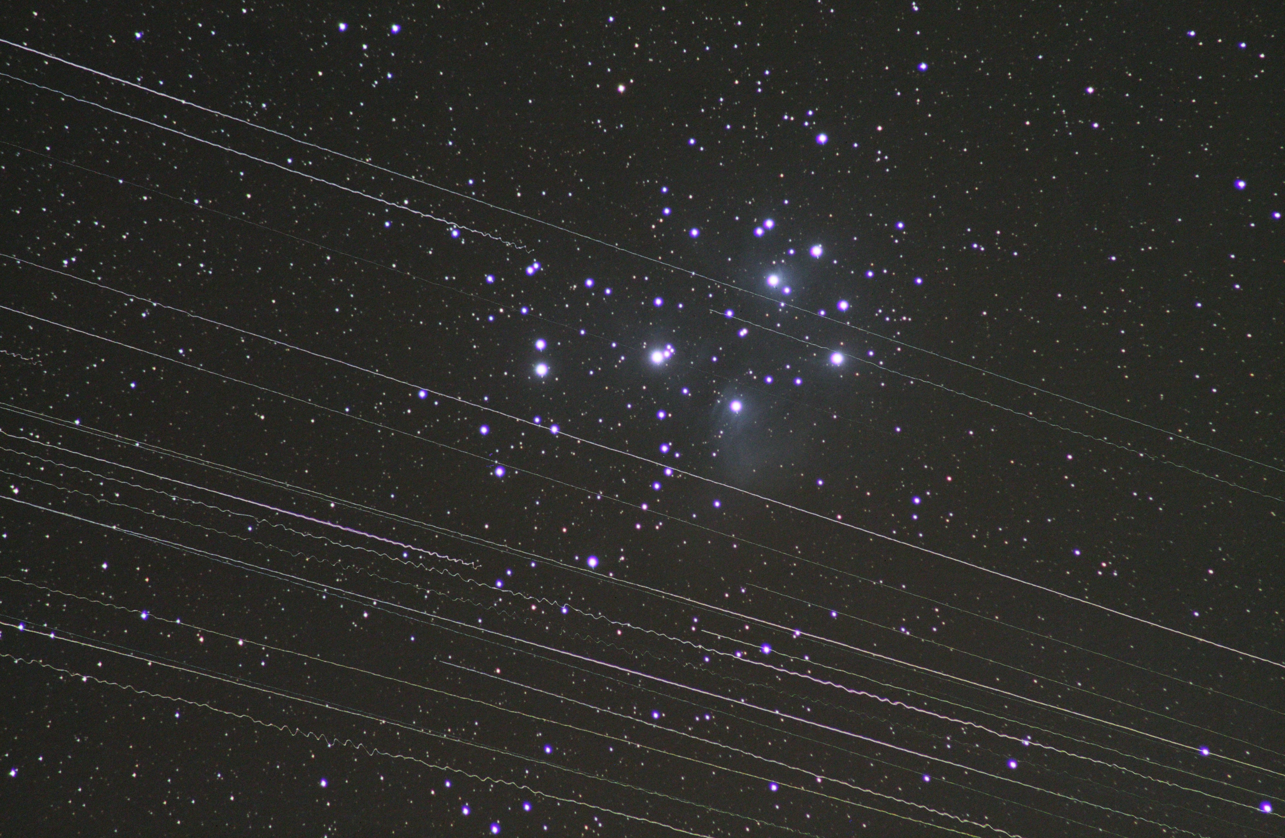 Ich wollte schon mal testen, wie sich der Venusdurchgang am besten fotografieren ließ. Wegen des ruppigen Windes kam erst mal nur das 70-300-mm-Objektiv zum Einsatz. An den verwackelten Satellitenspuren erkennt man die Windböen (Stärke 3-5), die den Teleskopeinsatz unmöglich machten. Danke, Herr Musk. Endlich mal was los am Himmel!