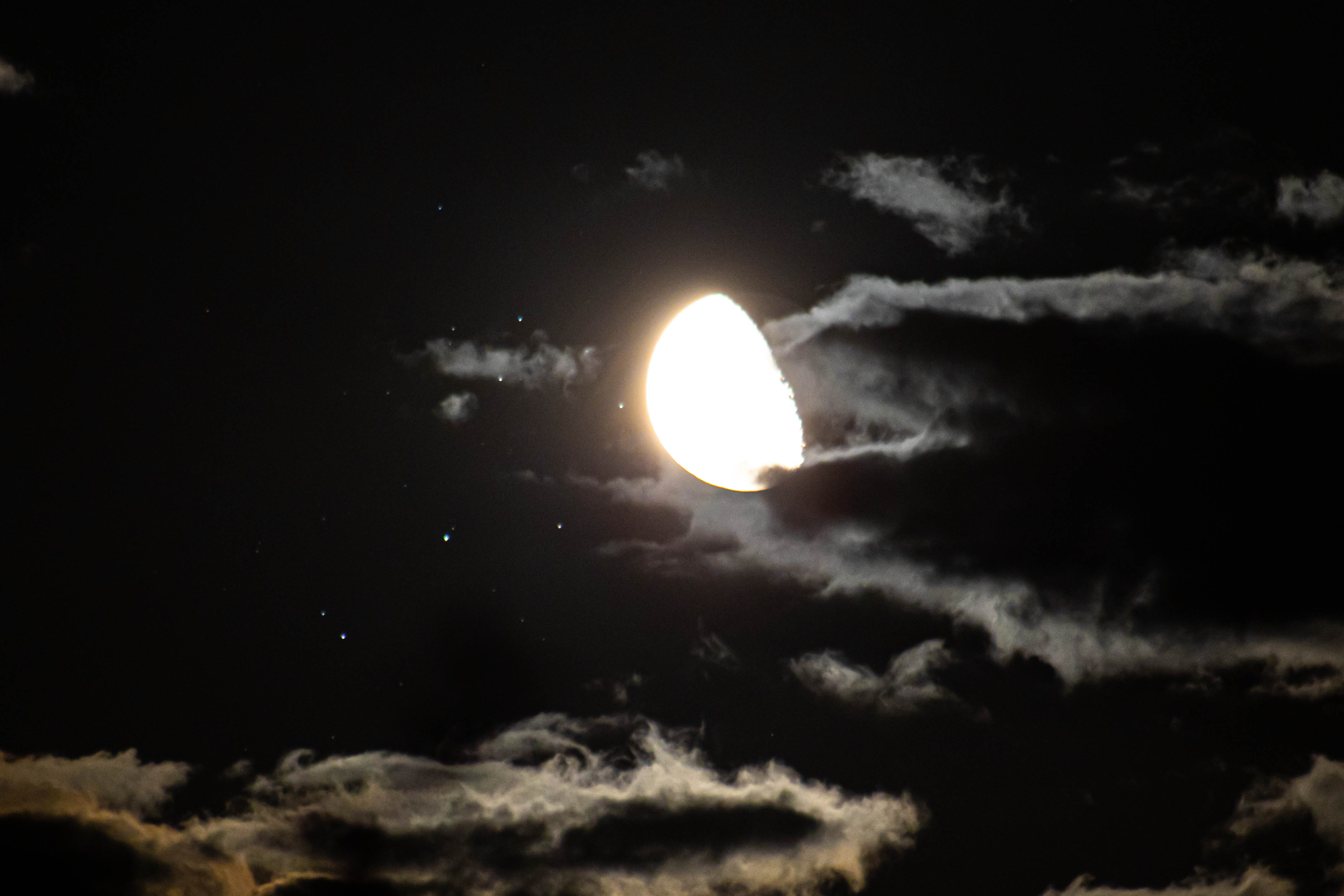 In jener Nacht bedeckte der Mond den offenen Sternhaufen der Plejaden, auch Siebengestirn genannt im Sternbild Stier. Schon nach dem Aufgang gegen 22 Uhr MESZ stand der Mond direkt neben den »Sieben Schwestern«. Durch die vielen Wolken gab es immer mal wieder ein schönes Motiv. Kurz nach Mitternacht gab der Mond die Plejaden dann wieder frei.