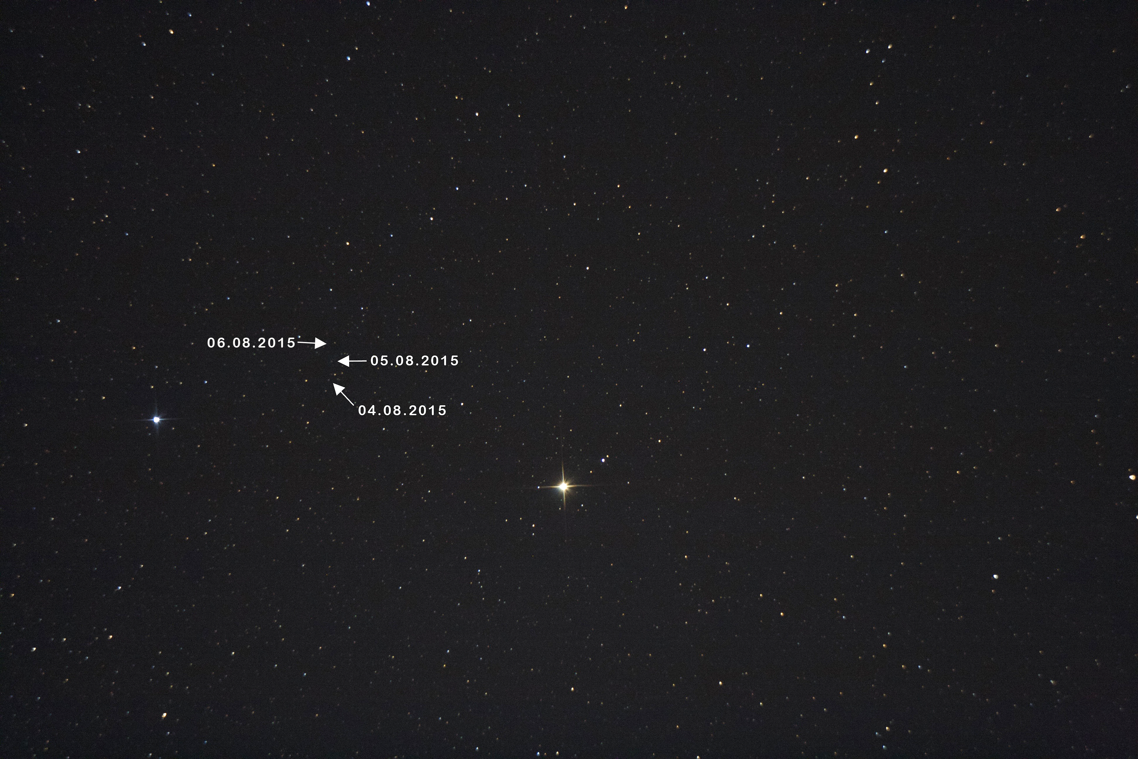 Vor einigen Jahren machte ich schon mal ein Bild des Zwergplaneten Pluto. Durch die Raumsonde New Horizons angespornt, wollte ich wieder Pluto beobachten. Leider geht dies durch mein Teleskop nur fotografisch. Ich wollte die Bewegung dieses kleinen Zwergplaneten zeigen.