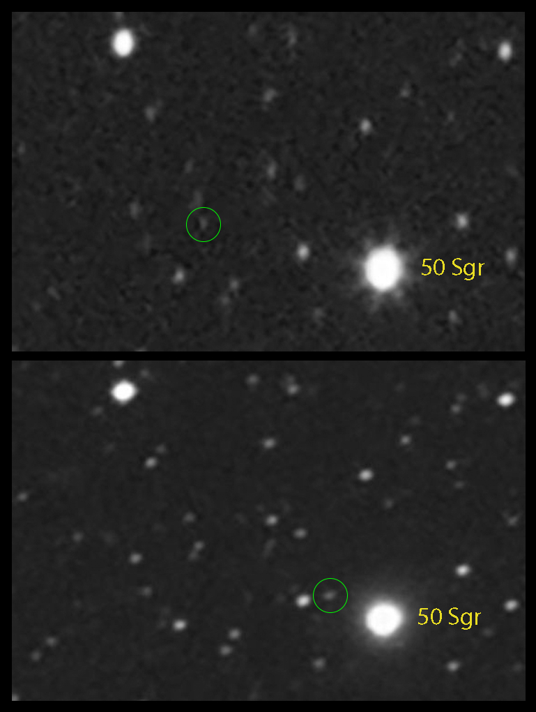 Am 1. Juli entstand die obere und am 3. Juli 2018 die untere Aufnahme. Pluto (grüne Ringe) wanderte in dieser Zeit rund 177 Bogensekunden. Mit einfacher Geometrie und Keplers drittem Gesetz berechnet sich in guter Näherung Plutos Entfernung von der Erde zu 34,7 Astronomischen Einheiten (Klaus-Peter Schröders Angabe in SuW Juli 2018: 32,6 AE).