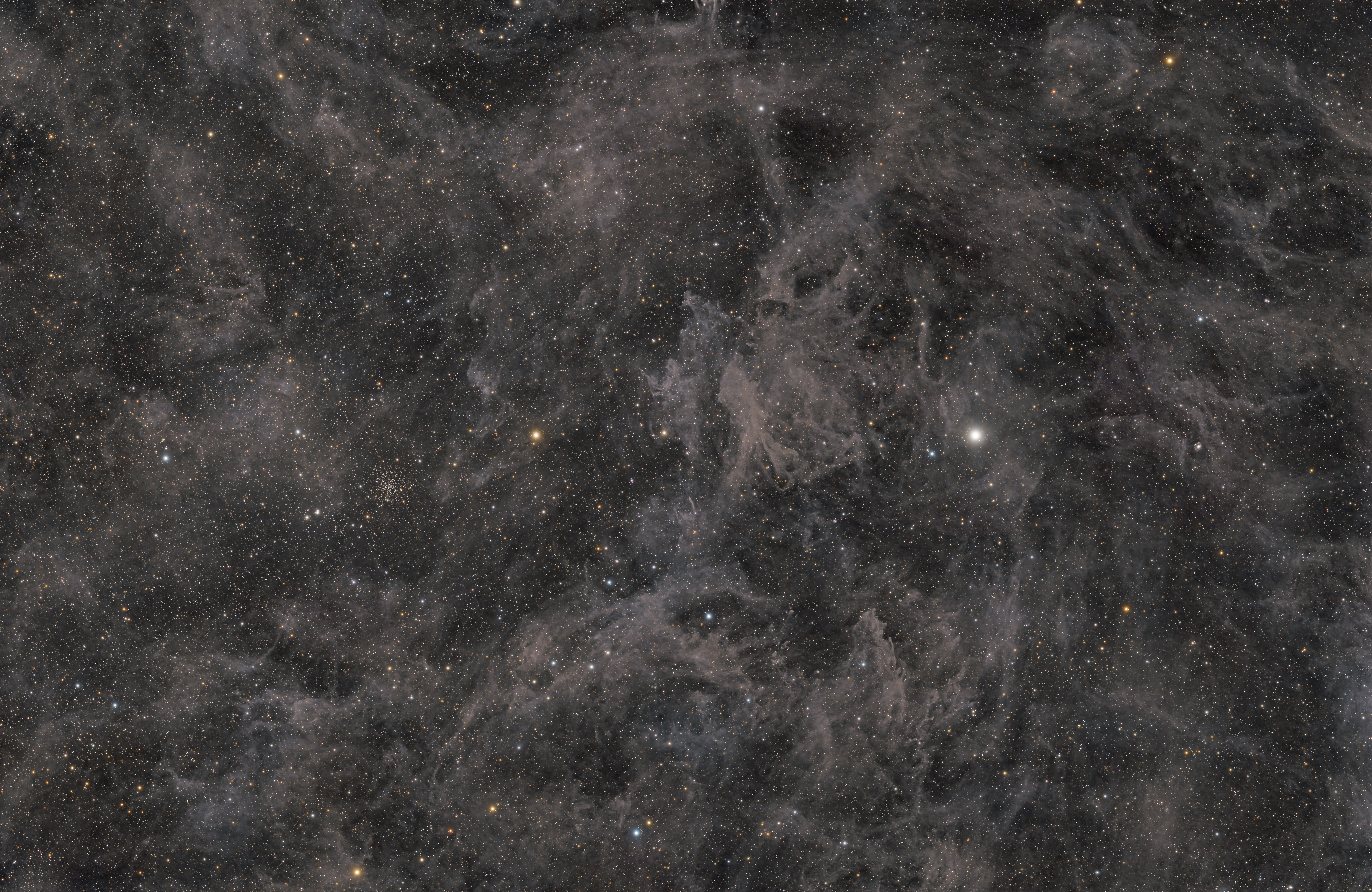Die Region um den Polarstern ist reich an interstellarer Materie, insbesondere feinem Staub, der das Licht der Sterne der Milchstraße reflektiert und streut. Dadurch entsteht ein schwaches, diffuses Leuchten, das in tiefen Aufnahmen sichtbar wird. Die Nebel in diesem Bereich bestehen vor allem aus Staubpartikeln, Wasserstoff, Kohlenmonoxid und anderen chemischen Elementen, die im interstellaren Raum vorkommen. Besonders auffällig sind diese Strukturen in der Nähe der Himmelspole, wo die Dichte von Staub und Gas besonders hoch ist. Der interstellare Staub entsteht durch verschiedene Prozesse wie Supernova-Explosionen, bei denen große Mengen an Materie in den Raum geschleudert werden. Auch der Materieausstoß durch Sterne, der sogenannte stellare Wind, trägt zur Bildung von Staub bei. Zusätzlich können sich in Molekülwolken durch gravitative Verdichtung weitere Staubstrukturen bilden. Ein weiteres astronomisch interessantes Objekt in der Nähe des Polarsterns ist der offene Sternhaufen NGC 188. Mit einem Alter von über sechs Milliarden Jahren gehört er zu den ältesten bekannten Sternhaufen in unserer Galaxie. Seine gut erhaltene Struktur liefert wichtige Informationen über die Entwicklung von Sternen in frühen Phasen der Milchstraße.