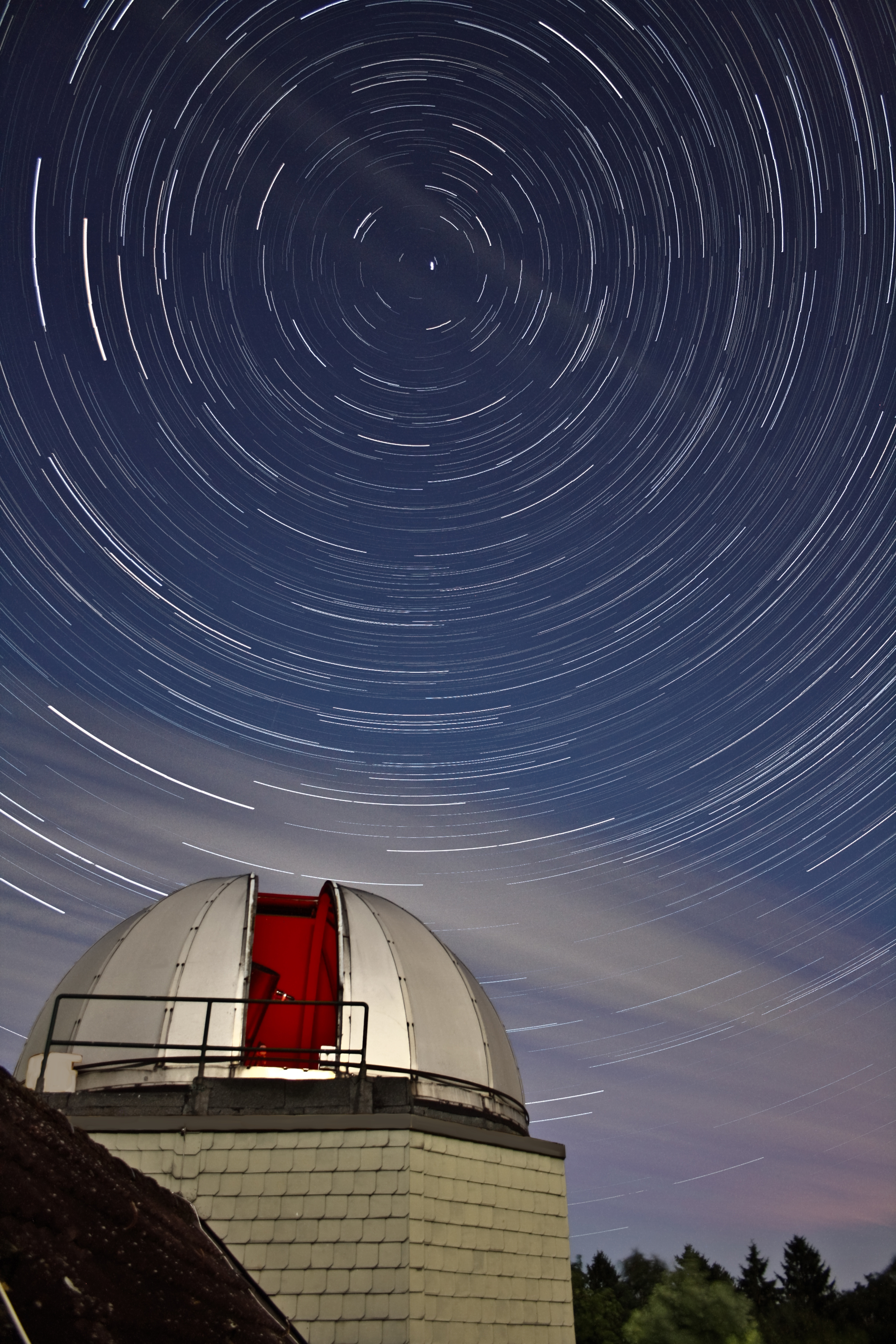 In der Nacht zum 12. August 2014 war das Wetter über Neumünster recht stabil und so ergab sich die Möglichkeit trotz des Vollmonds auf Perseidenjagd zu gehen. Bei rund 1000 Aufnahmen in dieser Nacht konnte ich auch rund zehn Perseiden auf den Bildern nachweisen. Aus einer Serie von 500 Bildern konnte ich mit Hilfe der Startrails-Software dieses Bild erstellen. Im Vordergrund die rund sechs Meter durchmessende Kuppel der VHS-Sternwarte Neumünster. Im Hintergrund, unschwer zu erkennen, die Region des Himmelsnordpols. Während der Belichtungsreihe zogen jedoch kurzzeitig Wolken durchs Bild. Diese wurden durch ein nördlich gelegenes Gewitter immer wieder angeleuchtet und erscheinen daher leicht rötlich.