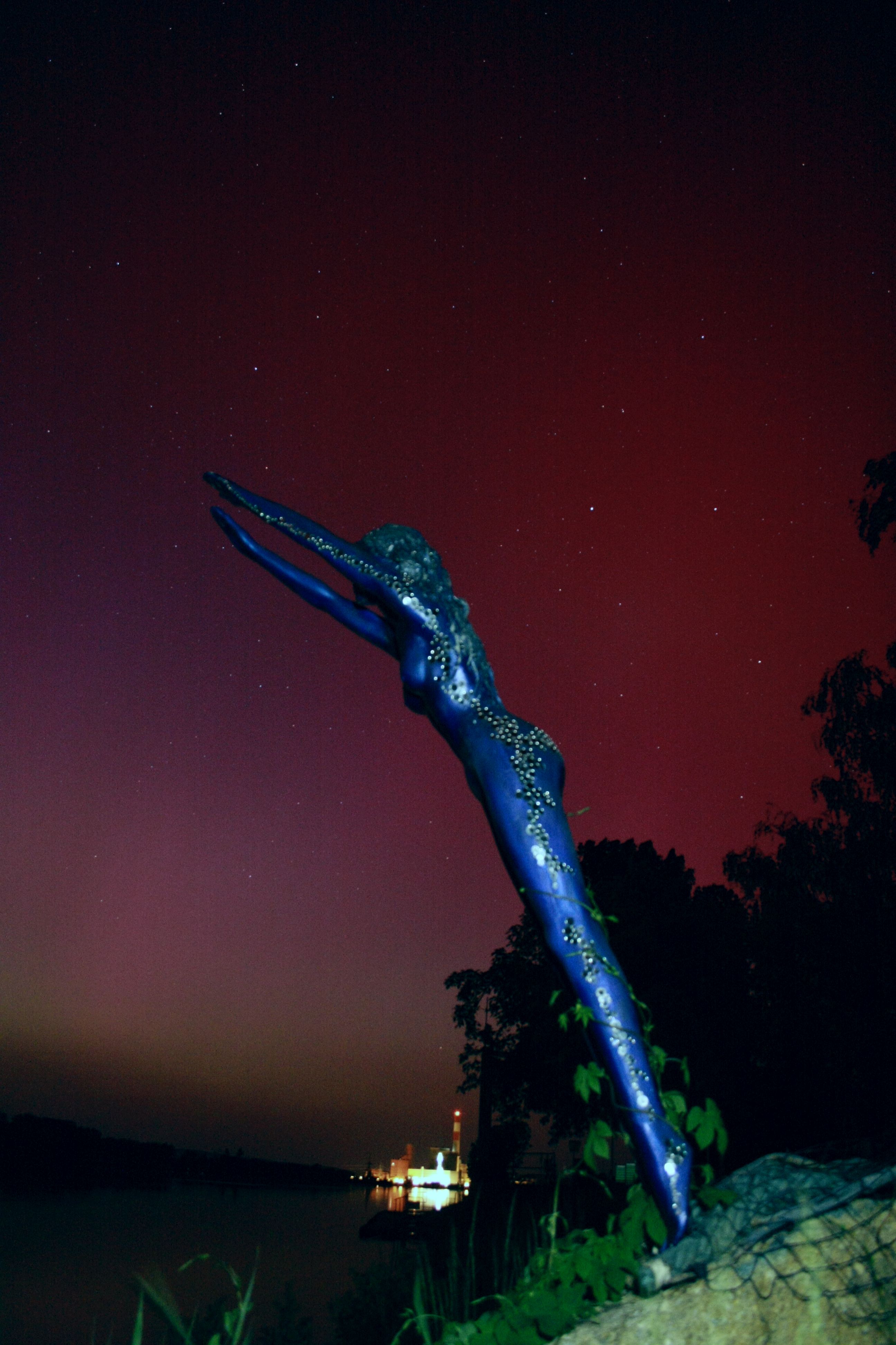Nach einem Astronomievereinsabend mit einem interessanten Vortrag konnte ich noch in Niederösterreich bei Hollenburg an der Donau sensationelle Polarlichter beobachten und fotografieren. Im Vordergrund das Donauweibchen beim Lokal Porto Velo, eine weibliche Figur mit Sprung in die Donau.