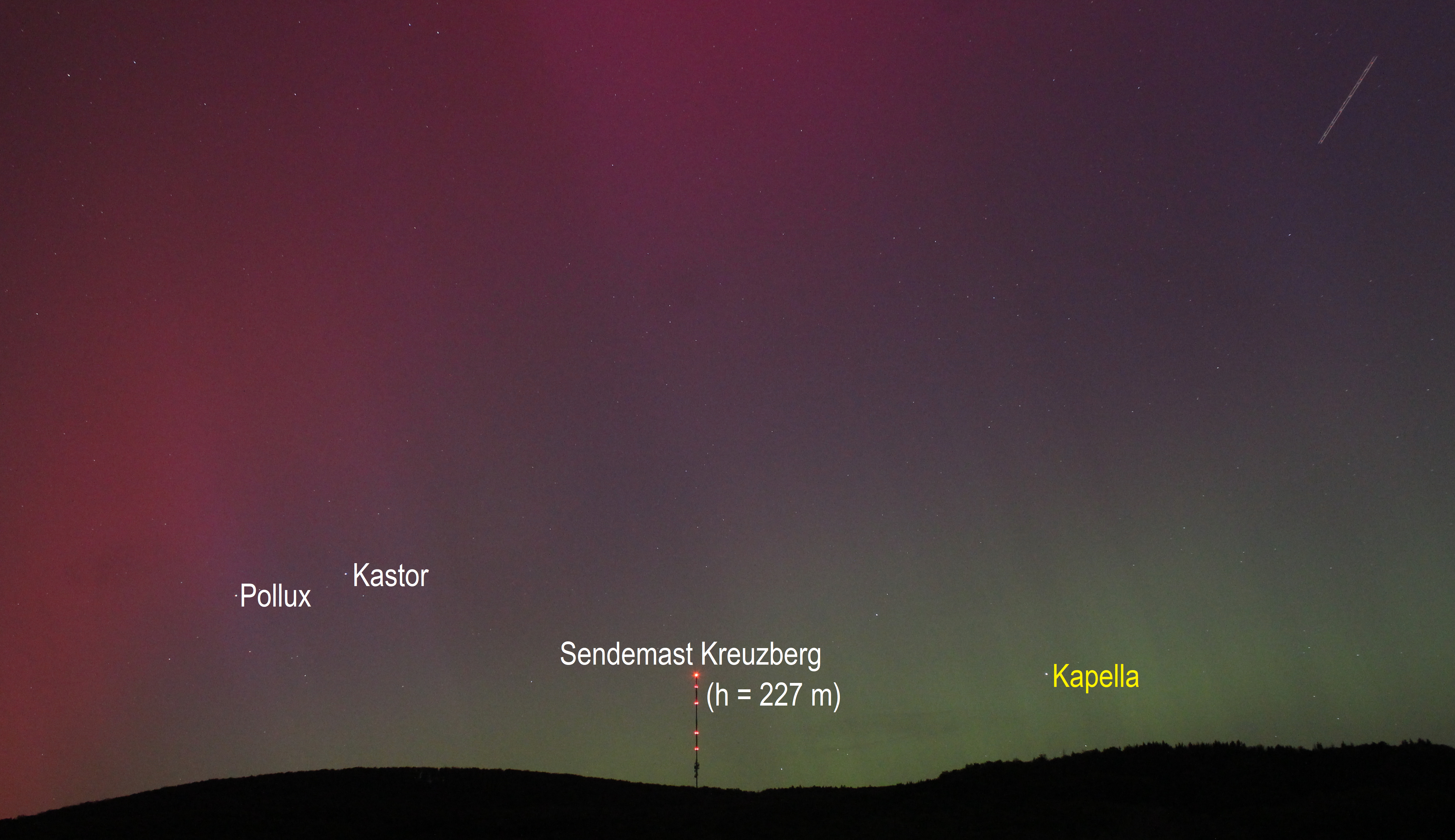 Leserbilder Astronomie: Polarlicht über dem Kreuzberg in der Rhön (Objekte beschriftet)