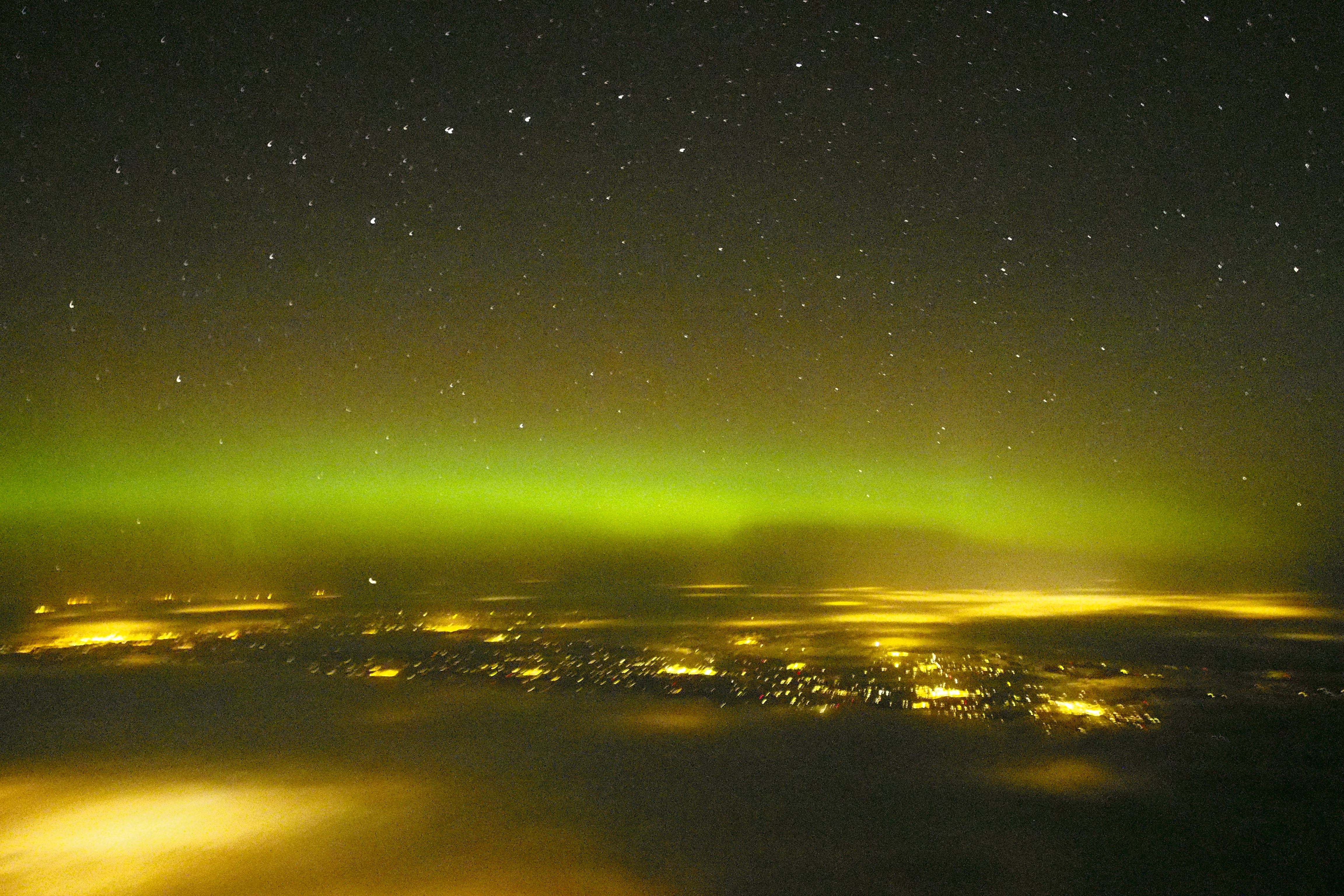 Mitte Oktober 2014 waren durch ein unruhiges Erdmagnetfeld in Nordeuropa immer wieder schöne Polarlichter zu sehen. Auf dem Flug von Frankfurt nach Stockholm zeigte sich auch vor dem Cockpit des Airbus A320 das eindrucksvolle Schauspiel.