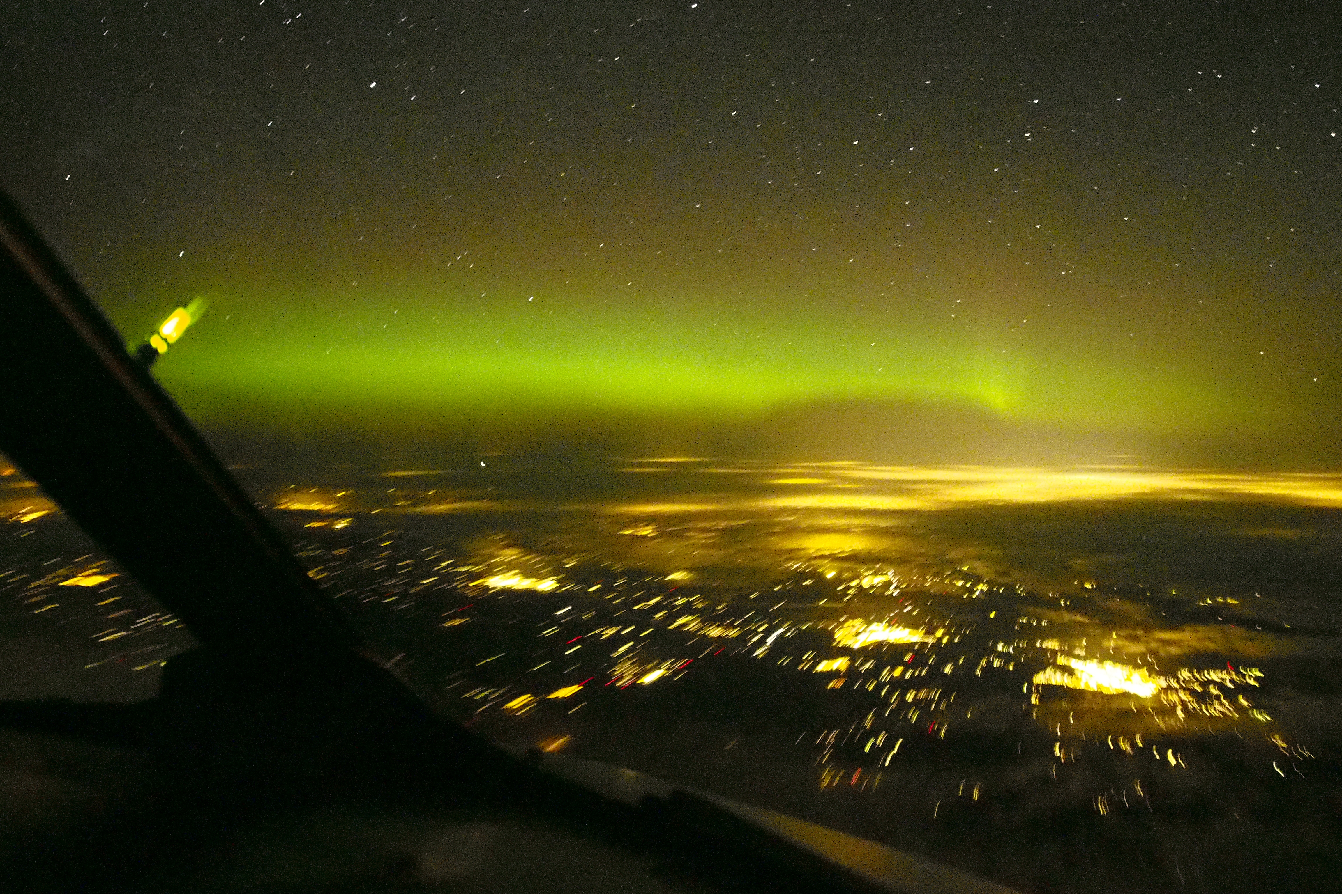 Mitte Oktober 2014 waren durch ein unruhiges Erdmagnetfeld in Nordeuropa immer wieder schöne Polarlichter zu sehen. Auf dem Flug von Frankfurt nach Stockholm zeigte sich auch vor dem Cockpit des Airbus A320 das eindrucksvolle Schauspiel. Hier befand sich das Flugzeug im Anflug auf Stockholm, am Horizont die Lichter der schwedischen Hauptstadt.