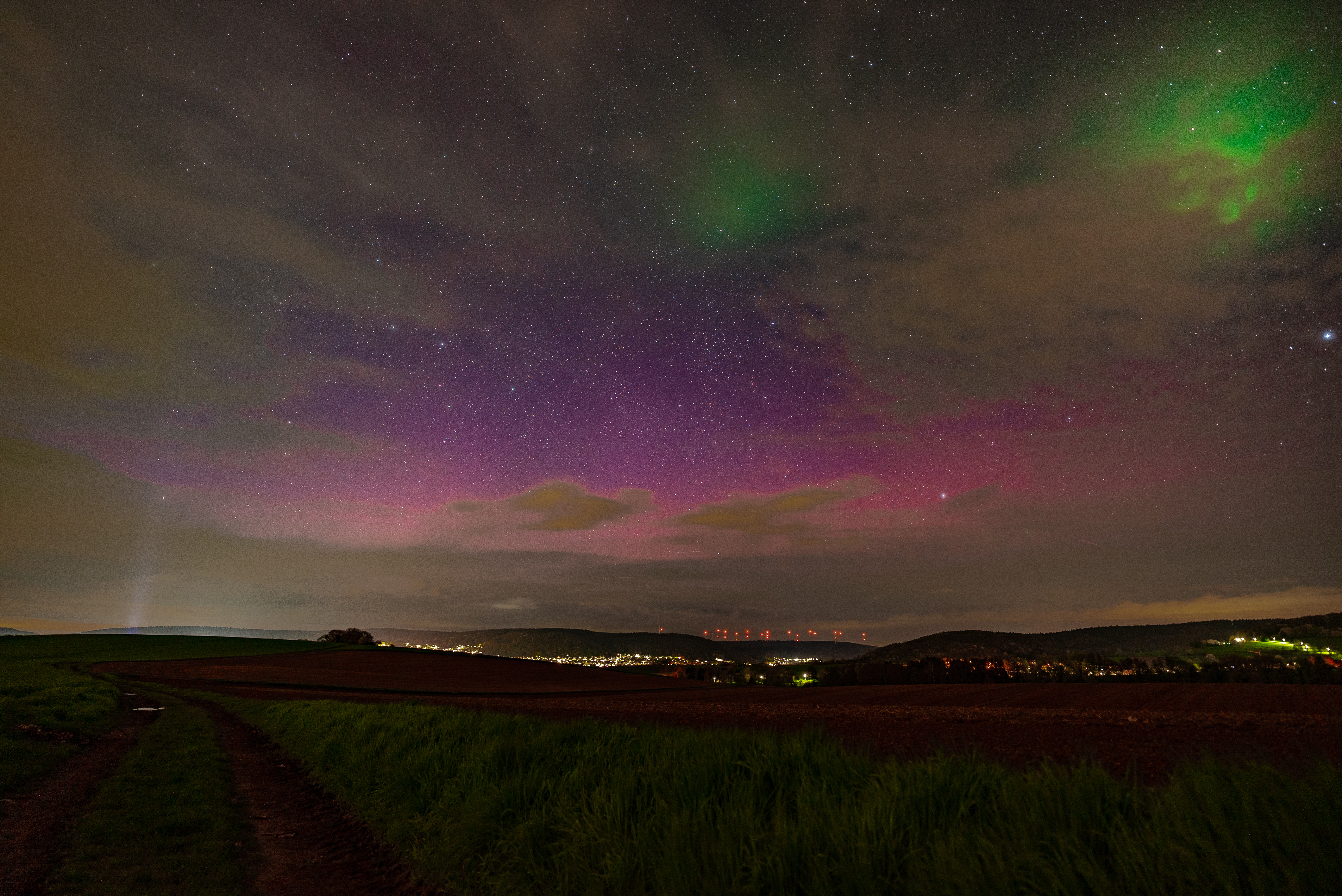 Polarlicht über Linsengericht im Spessart, Richtung Norden aufgenommen.