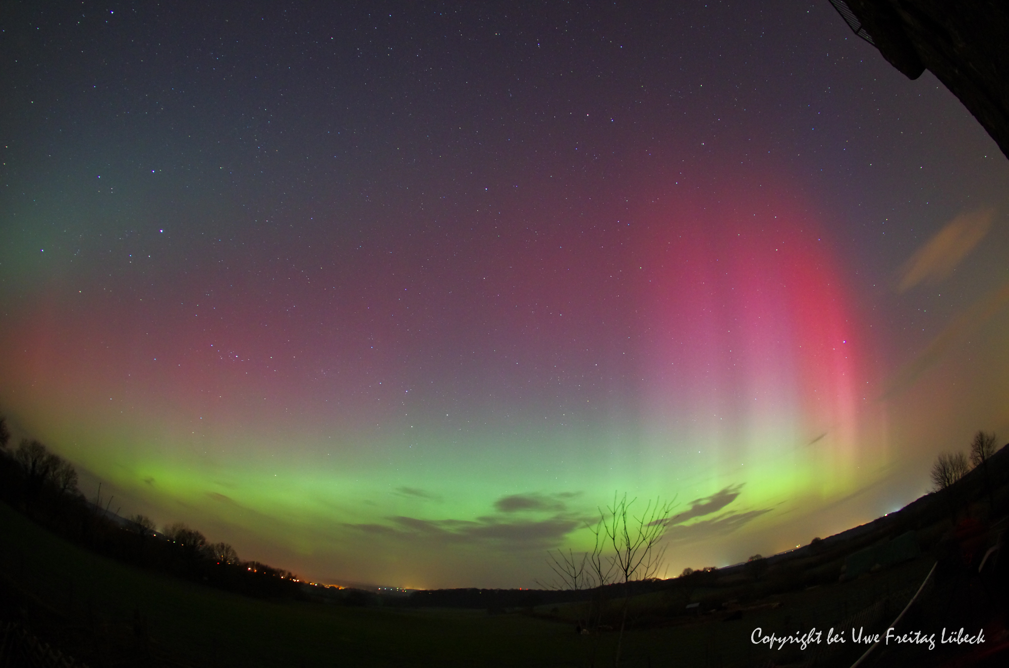 Polarlicht am 17. 03. 2015 bei Lübeck auf dem Pariner Berg bei der Bismarcksäule.