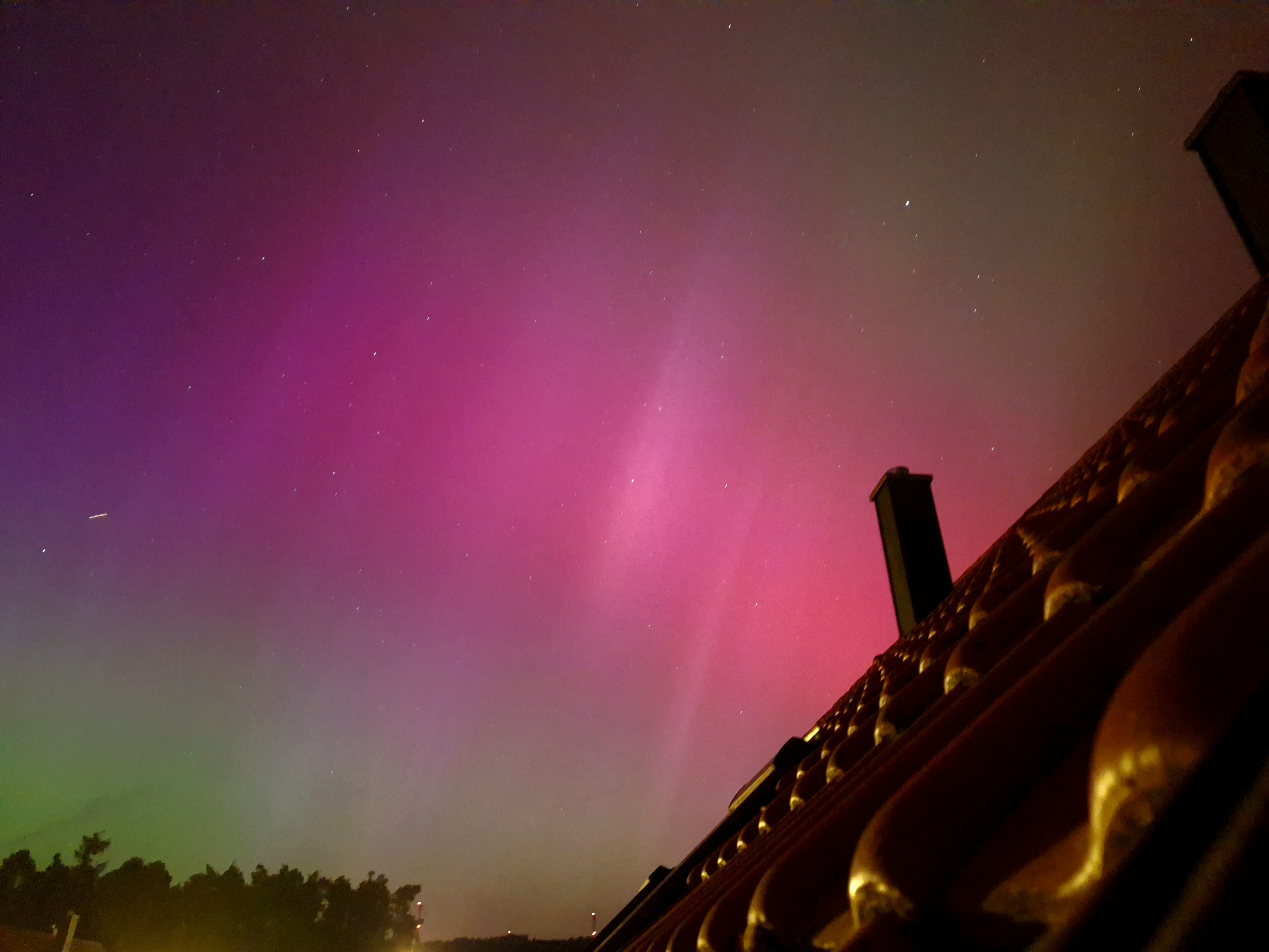 Der Himmel färbte sich am 10. Mai 2024 um etwa 22:30 Uhr stark rosa über Wernberg-Köblitz, die Ursache war ein G 5 (stärkste Kategorie) starker Sonnensturm, der die Erde traf! Es war schon fast magisch, wie die lila-rosa-grünen Nordlichter für mehr als 1 h am Himmel tanzten! Alle 11 Jahre durchgeht die Sonne einen Zyklus, an dem sie ihre minimale und maximale Aktivität erreicht, für 2025 wird das nächste Sonnenmaximum erwartet. So helle Nordlichter gab es seit 21 Jahren nicht mehr, das letzte Mal, an dem man sie so gut mit bloßen Auge sehen konnte war im Oktober 2003! Polarlichter entstehen, wenn ein Sonnenwind die Erde trifft, durch das starke Magnetfeld der Erde treffen die elektrisch geladenen Teilchen des Sonnenwindes auf die oberen Schichten der Erdatmosphäre, bei der sie anschließend die Luftmolekühle zum leuchten anregen. Der KP Index war am 11. Mai etwa gegen 1:23 Uhr auf 9 von 9, sogar teilweise auf 11 über den Maximalwert, deshalb war der halbe Himmel beim fotografieren nur noch rosa! Vom 11 bis 13. Mai gab es zwar auch Nordlichter zu sehen, die aber viel schwächer als die vom 10 bis 11. Mai waren, deshalb konnte man sie teilweise nur in Norddeutschland sehen. So ein starkes Ereignis wird es so schnell nicht wieder geben, aber vielleicht sieht man in diesen und kommenden Jahr noch Nordlichter die etwas schwächer als die vom 10 bis 11. Mai sind! ☀️🌙
