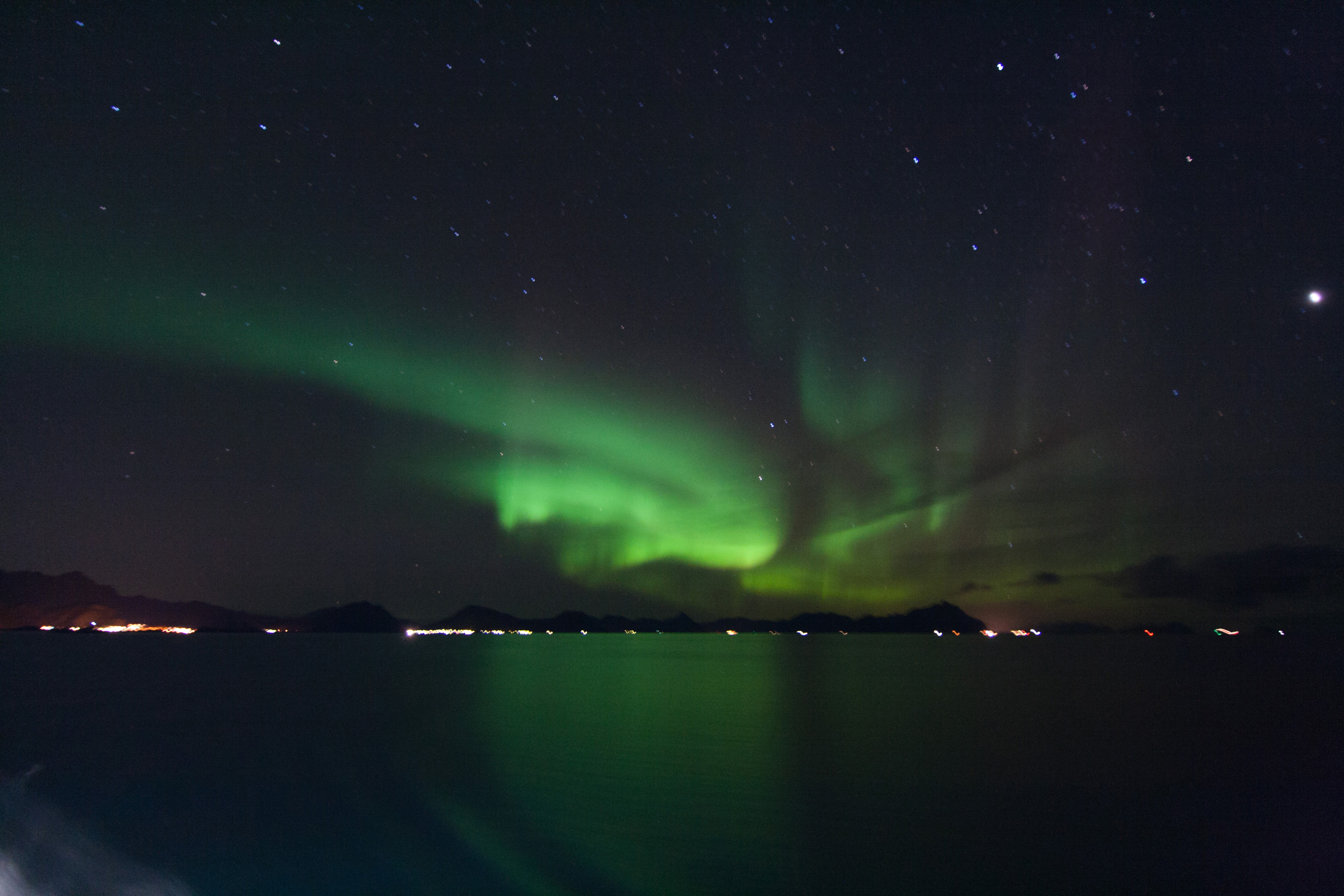 Polarlicht auf der Norwegenreise mit der Hurtigrute MS Kong Harald im Oktober. Auf der südgehenden Route spielte das Wetter nach der Abfahrt von den Lofoten wieder mit und ermöglichte es bei ruhiger See die Abschlussvorstellung des Polarlichts zu genießen.