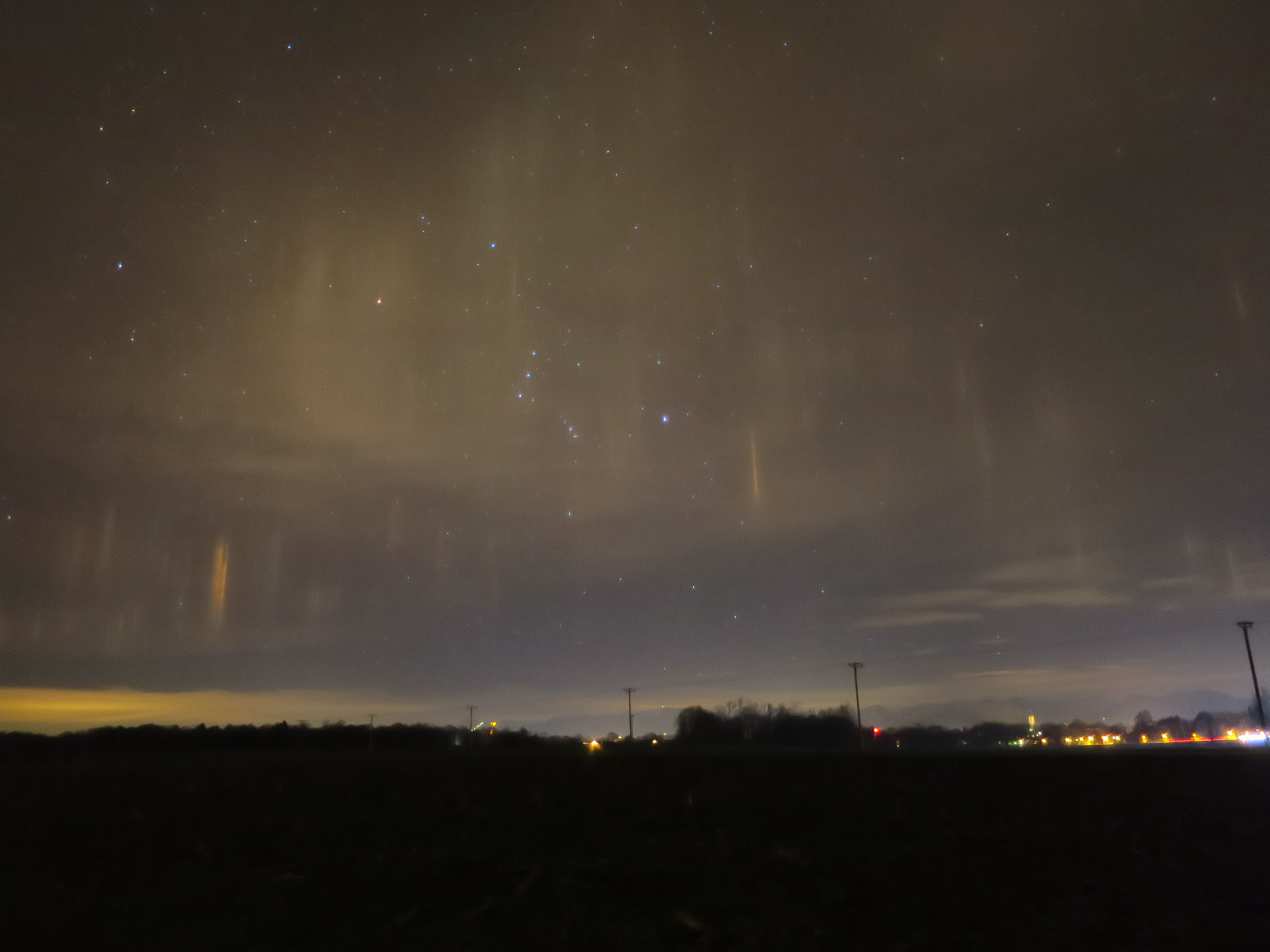 Diese Aufnahme wurde am 13. Dezember 2017 in Bad Aibling gegen 21:46 Uhr MEZ gemacht. Es war etwa 0° und leicht windig. Unter https://www.geophysik.uni-muenchen.de/observatory/geomagnetism/taegliche-magnetogramme waren leichte Schwankungen des Erdmagnetfeldes zu erkennen. Können aber auch Lichtsäulen aus Reflexionen durch Eiskristalle sein (http://www.atoptics.co.uk/halo/lpil.htm).