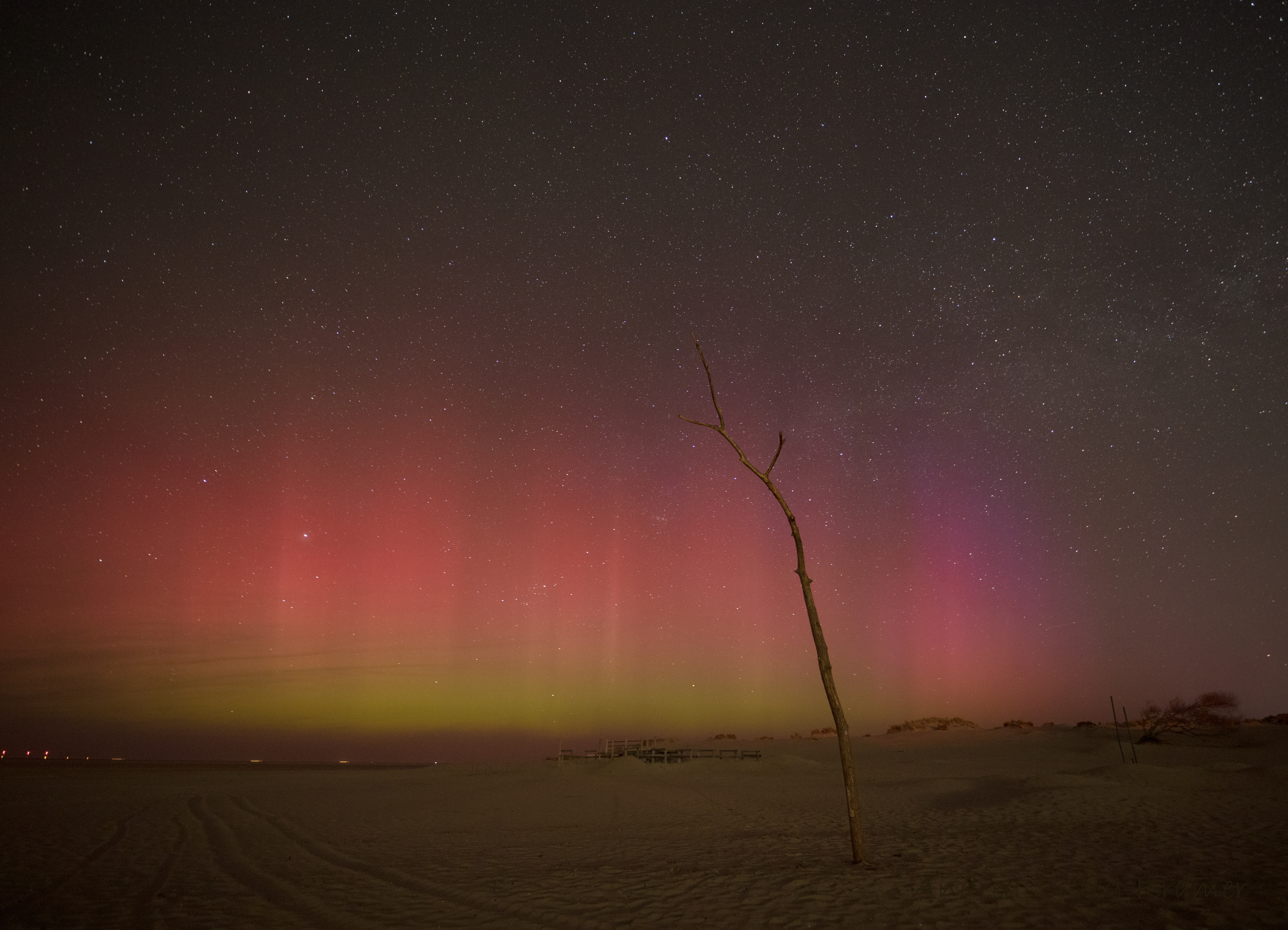 Nach einer Woche bestem Astrofoto-Wetter machte ich mich am vorletzten Abend meines Aufenthaltes auf Borkum am 21. März wieder auf Motivsuche im nord-östlichen Teil der wunderschönen Nordseeinsel. In den vergangen Nächten waren auf vielen Fotos schon schwache, pinkfarbene Polarlichter zu erkennen. An diesem Abend erhielt ich gegen 23 Uhr via Apps und Chats Polarlicht-Warnungen. Es wurden Polarlichter der Stufe 5 von 9 vorhergesagt. Kurze Zeit später ging es dann auch wirklich los: Der gesamte nördliche Himmel erstrahlte in allen Polarlicht typischen Farben. Dieses Bild entstand am Nordstrand. Die Farben der Aurora waren zu diesem Zeitpunkt auch deutlich visuell zu erkennen. Was für ein spektakulärer Anblick! Ich konnte mein Glück kaum fassen: Ich war zur richtigen Zeit am richtigen Ort – weit genug im Norden.