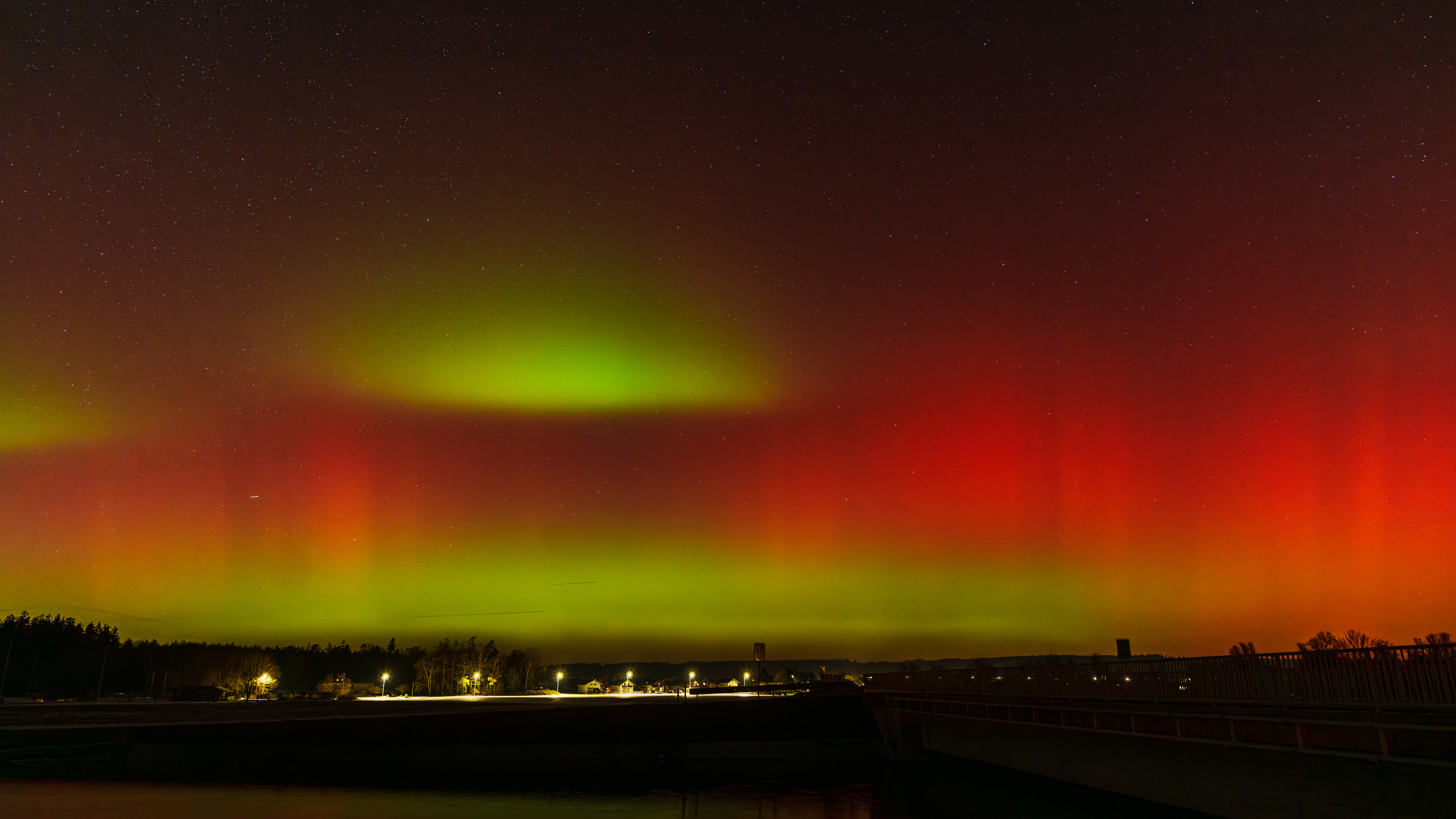 Ich liege so auf der Couch und bereite mich auf einen gemütlichen Abend vor, da meldet sich eine App auf meinem SmartPhone. Der KP-Index sei 8,33 und es gäbe eine geringe Wahrscheinlichkeit Polarlichter zu sehen. Na mal rauf in den ersten Stock und aus dem Fenster nach Norden schauen. Hmm, könnte sein, da schimmert was. Kamera raus und mal den Sensor da drin gucken lassen. Tatsächlich! Also Kamera und Stativ einpacken (mich selber auch) und raus in die Kälte. Ich habe mich auf eine Brücke über den Inn-Kanal bewegt und schon mit bloßem Auge etwas wabern gesehen. Kurz vor 23:00 Uhr war's bei uns am schönsten, da entstand dieses Foto.