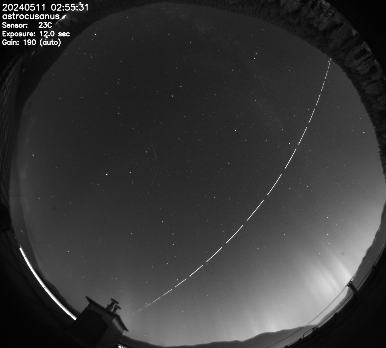 Dieses Allsky-Kamera-Bild zeigt den Himmel über Bruneck, Südtirol. Man sieht die Polarlichter im Norden wie auch den Vorüberflug der ISS. Um die Strichspur der ISS vollständig zu machen, wurden die fehlenden Teile am Computer aus den anderen Bildern entnommen und eingesetzt.