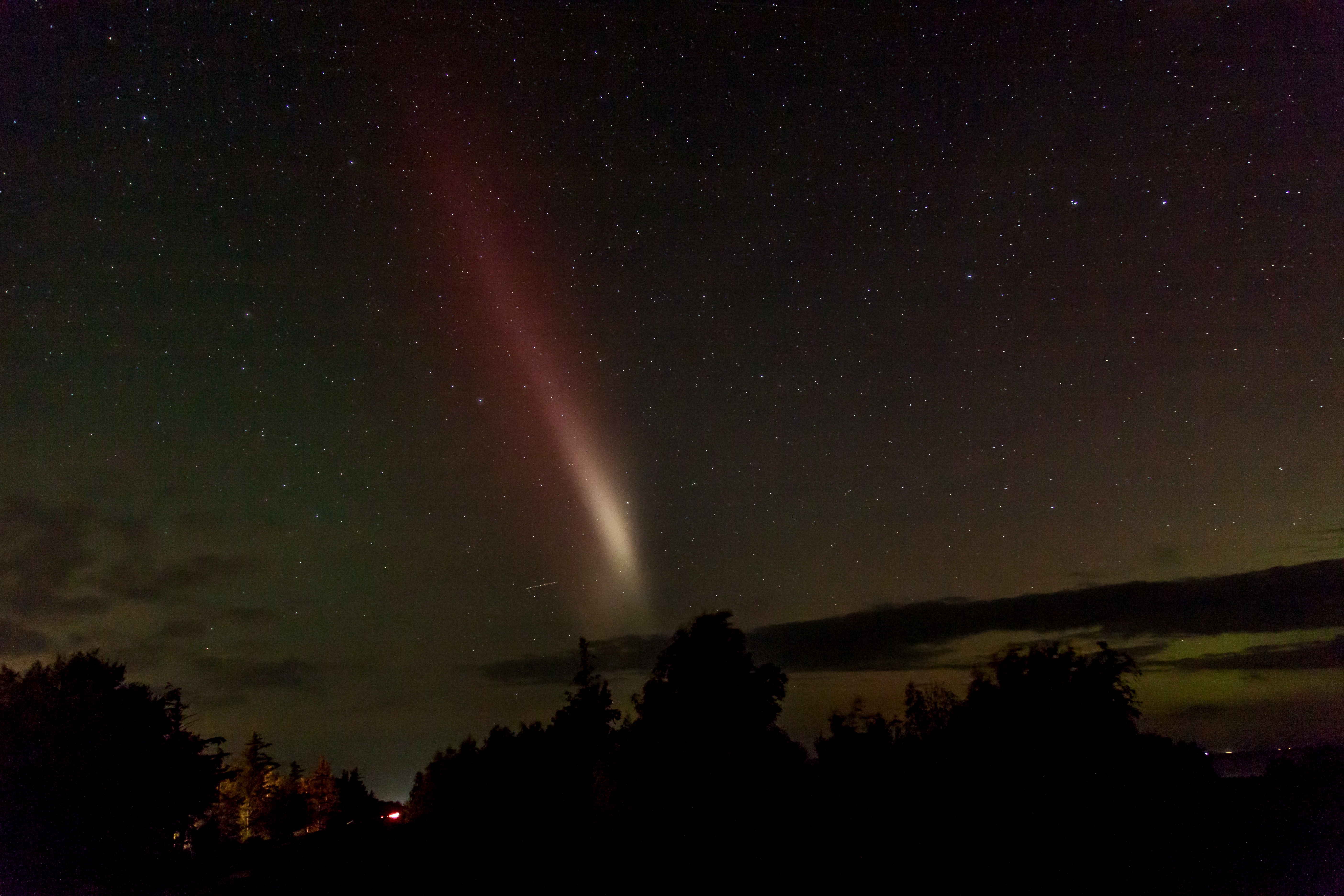 Die Bewölkung über Fehmarn zeigte große Lücken, die Luft war sehr feucht, aber ich stellte ich mein Stativ mit Kamera trotz dieser Widrigkeiten auf den Deich um eventuell Polarlichter zu fotografieren. Auf Grund der feuchten Luft musste ich des öfteren die Linse putzen, und nach etwa 90 Minuten tropfte es sogar von der Kamera herab. Im Norden zeigten sich ganz schwache Farben auf dem Kameramonitor, nichts aufregendes. Als ich aber zufällig nach Westen schaute, sah ich eine längliche weiße Wolke, jedenfalls dachte ich, es sei eine Wolke. Intuitiv richtete ich die Kamera aber auf diese Wolke und war erstaunt, was ich im Monitor sah: das Polarlichtphänomen Steve.