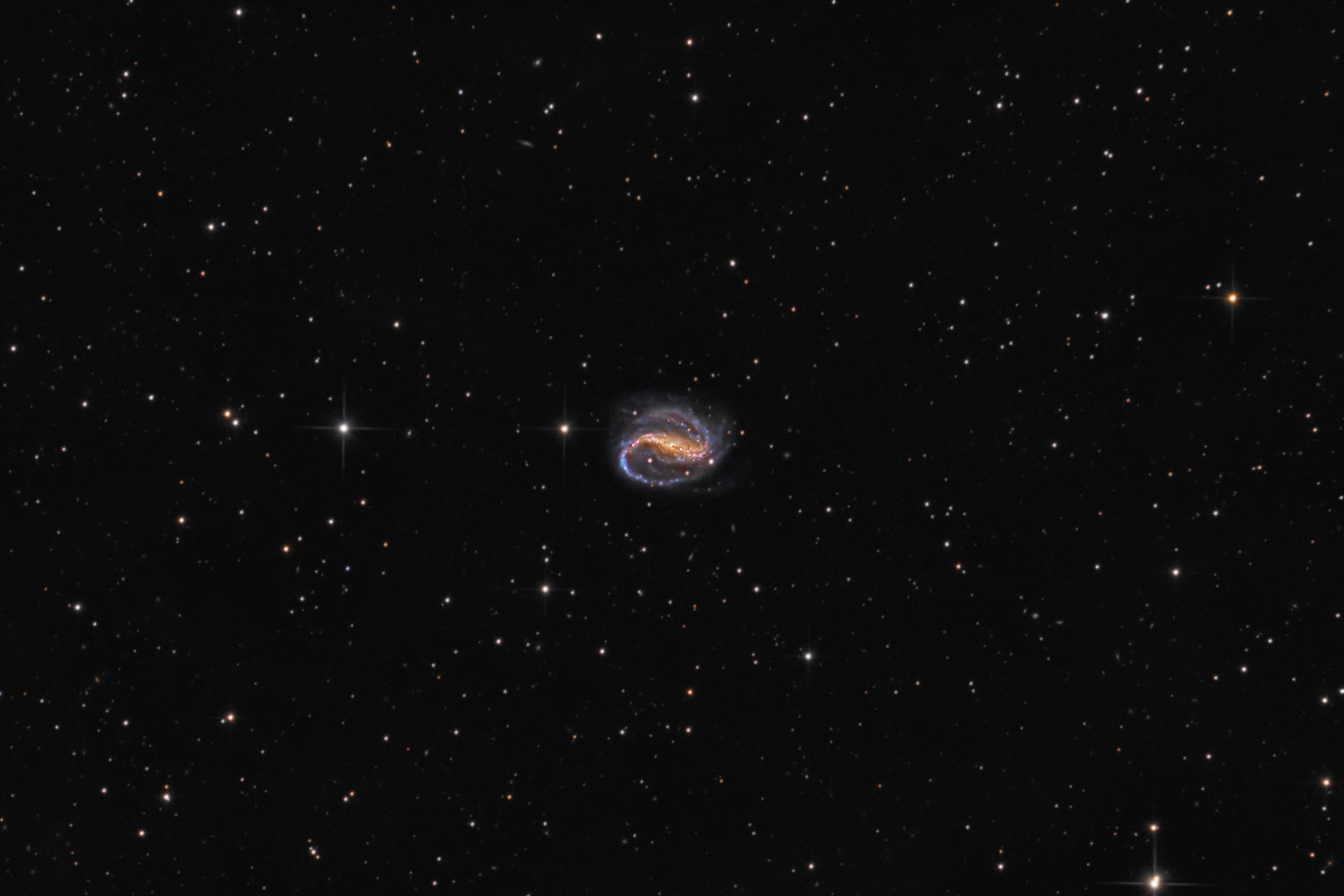 Es war eine Herausforderung diese Balkenspiralgalaxie mit einer Helligkeit von 10,9 mag und einer Flächenausdehnung von 4,1 Bogenminuten mal 3,1 Bogenminuten zu fotografieren. In vier Oktobernächten waren dann 124 Einzelbilder mit je fünf Minuten beisammen, so dass ich eine erfolgversprechende Bildverarbeitung wagen konnte.