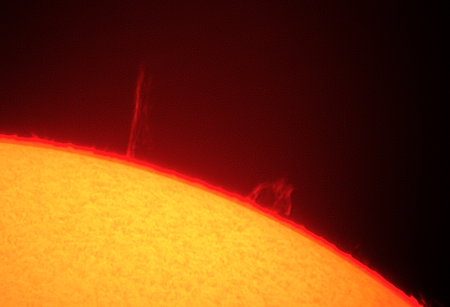 Ein schöner Gegensatz, diese kerzengerade aufsteigende Protuberanz neben der runden kleinen. Die Schärfe (man sieht es an den Spikulen) wurde durch die Zirren nicht sehr gemindert, der rötliche Schimmer im Bild aber ist darauf zurück zu führen. Es fand sich leider keine Lücke. Das Motiv wiegt diesen kleinen Nachteil des Bildes aber auf.