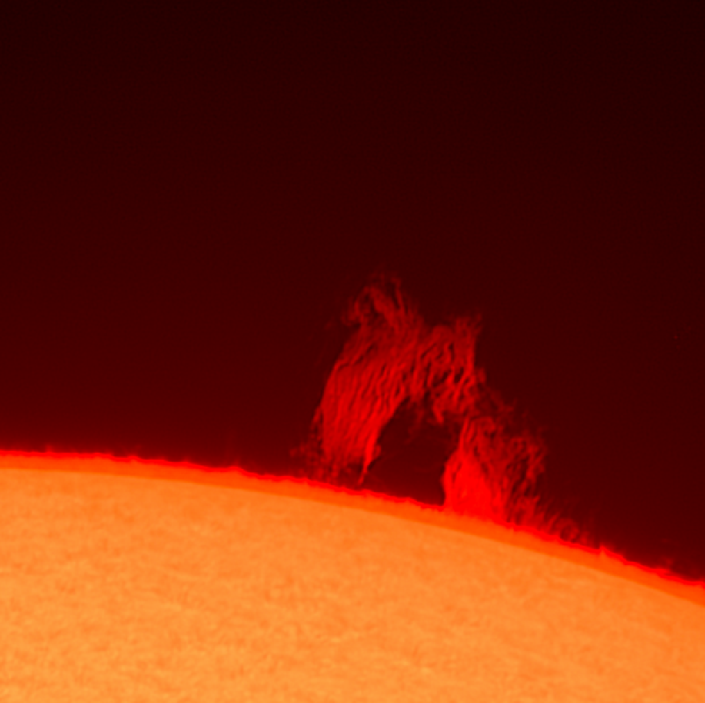 Um zu zeigen, wie ein Sonnen / Protuberanzenbild original aussieht, stelle ich diese Protuberanz ein. Das Bild wurde ausschließlich im Histogramm bearbeitet. Der Dunst hatte den Hintergrund des aus dem Video gestackten Bildes rötlich gefärbt. Das habe ich korrigiert. Es wurde ansonsten nach dem Stacken mit AutoStakkert nicht weiter bearbeitet. So hat man eine Vorstellung, wie das Bild direkt aus dem Teleskop erscheint.
