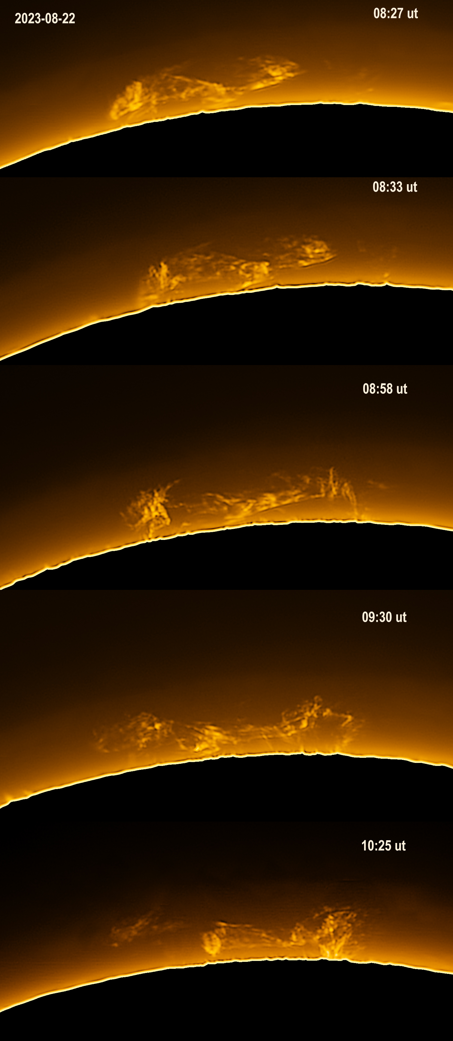Gestern konnte ich bei besten Bedingungen eine kleine, aber recht aktive Protuberanz am Nordrand der Sonne fotografisch beobachten. Innert etwa zwei Stunden zeigt das Bild die einzelnen Situationen mit Zeitangabe.