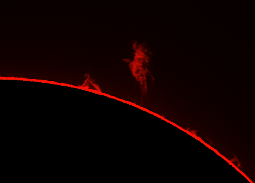 Heute Nachmittag hat sich augenscheinlich diese Protuberanz von der Sonne gelöst. Leider konnte ich nur das kleine PST nutzen, die Sonne stand schon recht tief und verschwand bald hinter dem Dach des Nachbarn. Da hätte der Aufbau des "Großen" zu viel Zeit in Anspruch genommen. Gut, dass es das PST gibt.