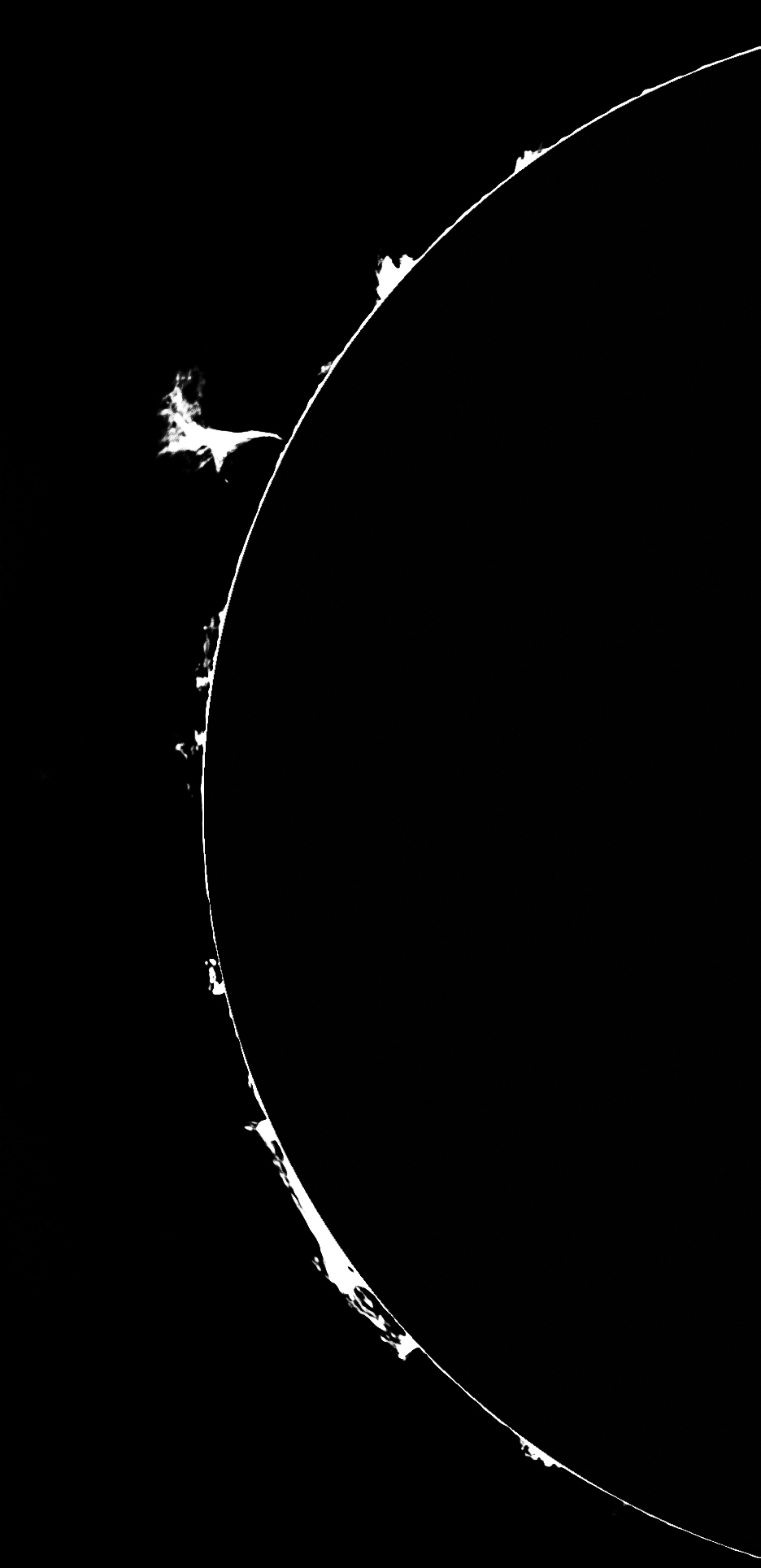 Heute wieder eine schöne losgelöste Protuberanz am östlichen Sonnenrand. Gut sichtbar in einer H-Alpha-Aufnahme und mit der abgedeckten Sonnenscheibe. Technik und Software: LUNT LS60 T Ha DS50 B 1200 PT und FT, ASI 178mm; 0,5 ms; 1000 frames; SharpCap, AutoStakkert!, Adobe Lightroom