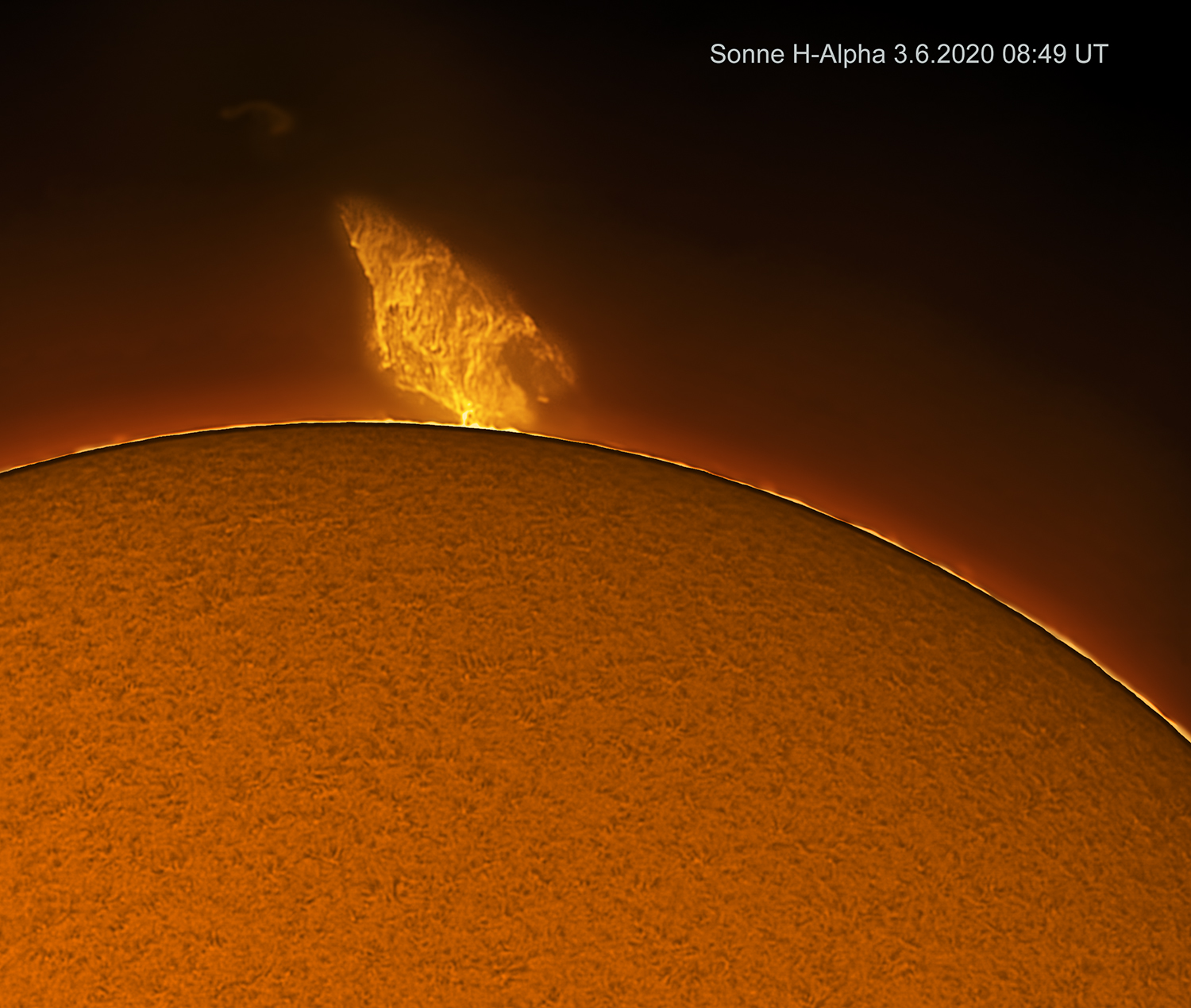 Am 3. Juni 2020 zeigte sich eine eindrückliche Protuberanz. An diesem Morgen war auch das Seeing recht gut. Für die Protuberanz wurden mit der ASI 178 MM 10000 Bilder mit 5.576 ms gewonnen. ROI 1000 x 1000 Pixel, Gain 216 = 42%. Davon fanden dann die besten ca. 1000 Bilder Verwendung. Stacken mit AutoStakkert und Drizzle 3x, danach RegiStax zum Schärfen. Instrument Lunt 60 x 500 B 1200. Für die Oberfläche sind mit dem gleichen Instrument ebenfalls 10000 Bilder mit 0.449 ms aufgenommen und ca. 800 Bilder weiterverarbeitet worden. worden. Nach dem Stacken und Schärfen sind die zwei Bilder mit PS eingefärbt, weiterverarbetet und überlagert worden. Kamerasteuerung mit FireCatpure.