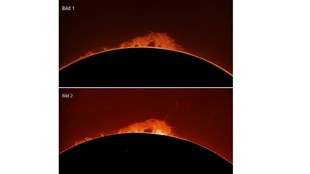 In einer recht ausgedehnten Protuberanz entwickelte sich innerhalb weniger Stunden ein Bereich erhöhter Aktivität mit einem Materieauswurf. Bild 1: 17 Uhr, Bild 2:20 Uhr